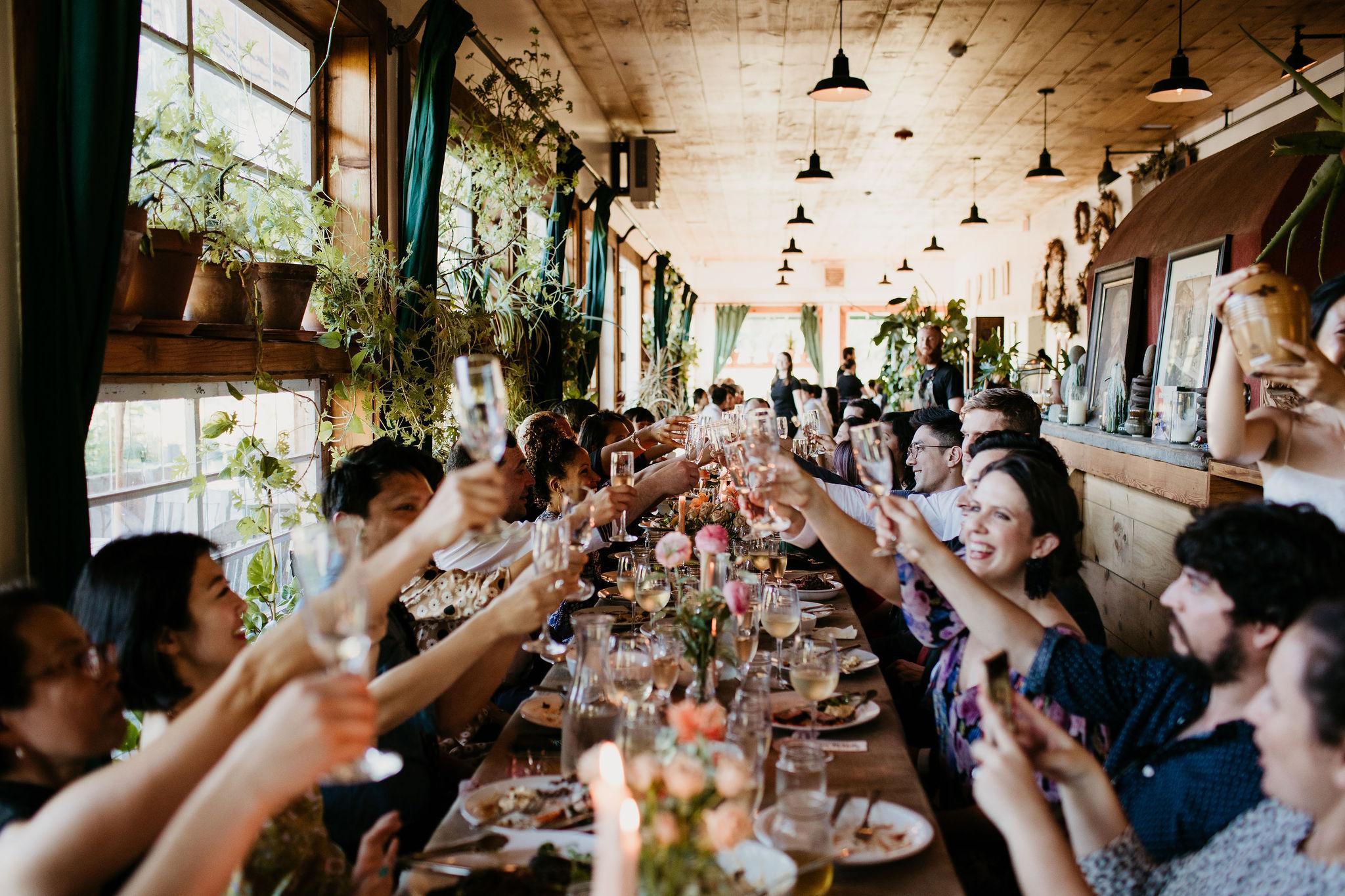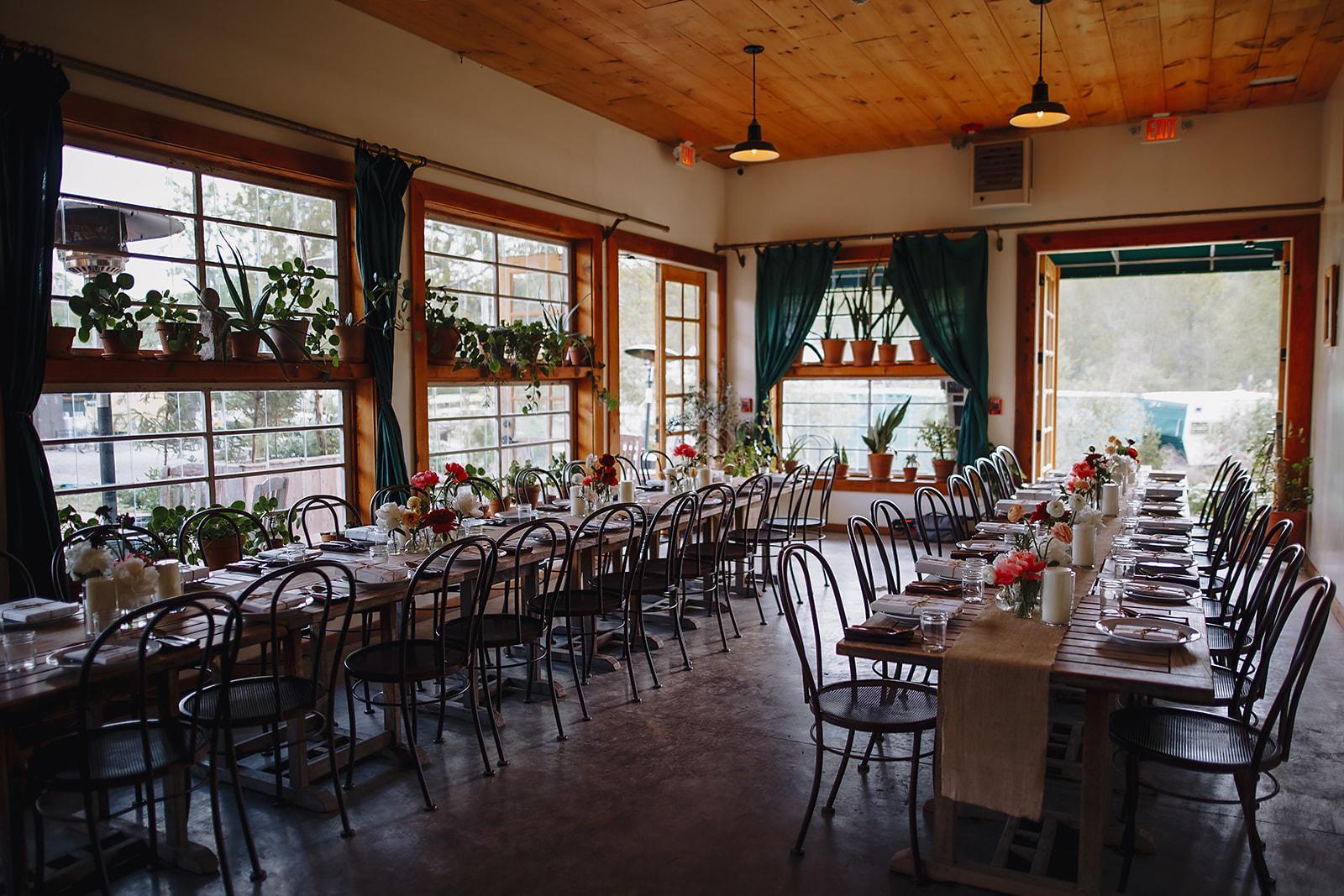 Filled weekly with hyper-seasonal florals and plants from the farm, the barn is a vibrant, walk-in ready space perfect for cocktail hours or intimate receptions. Guests can grab a drink at the beautiful wooden bar or mingle near the long harvest table laden with cheese, charcuterie, crudité, farm pickles, and house-made dips. The bright, airy main room flows seamlessly into the secluded backyard, providing a storybook hidden escape for you and your guests.