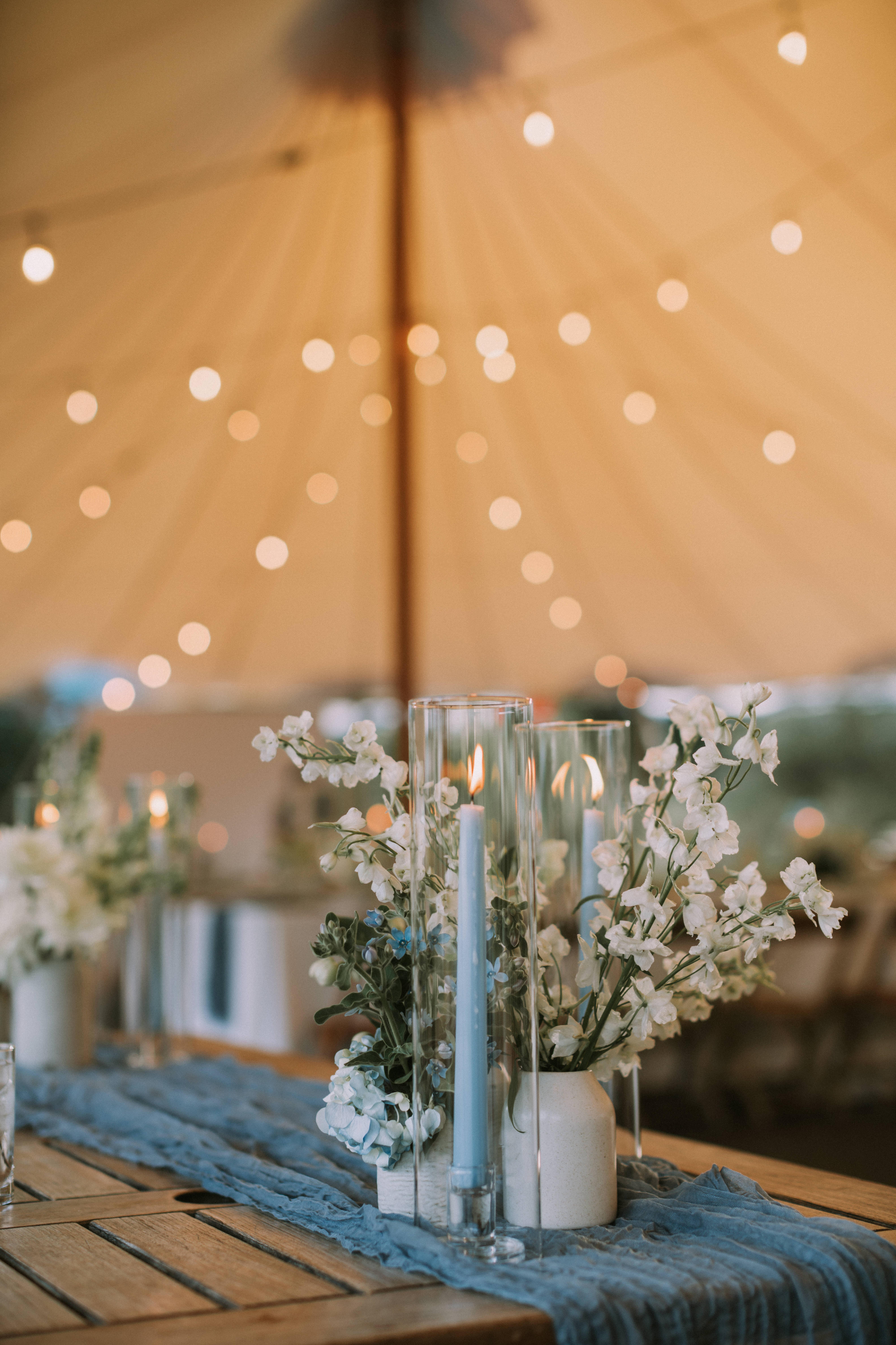 Tent, flooring, clear side walls, Edison bulb bistro lighting (dimmable), fans, heaters, bar furniture, lawn with fire pit, tables, chairs, plates, flatware, glassware, linens, napkins, table runners, candles, personalized menus, table numbers