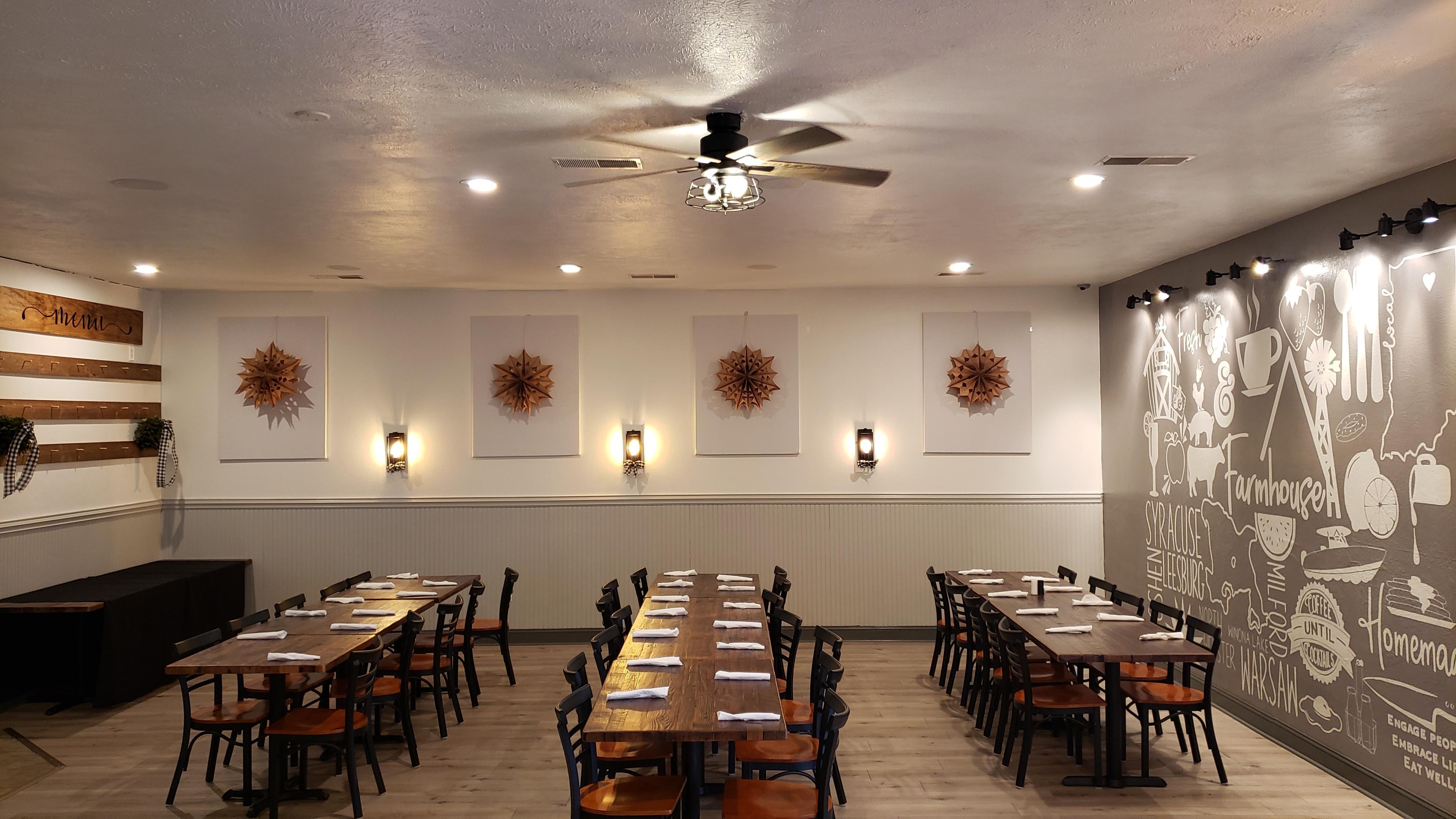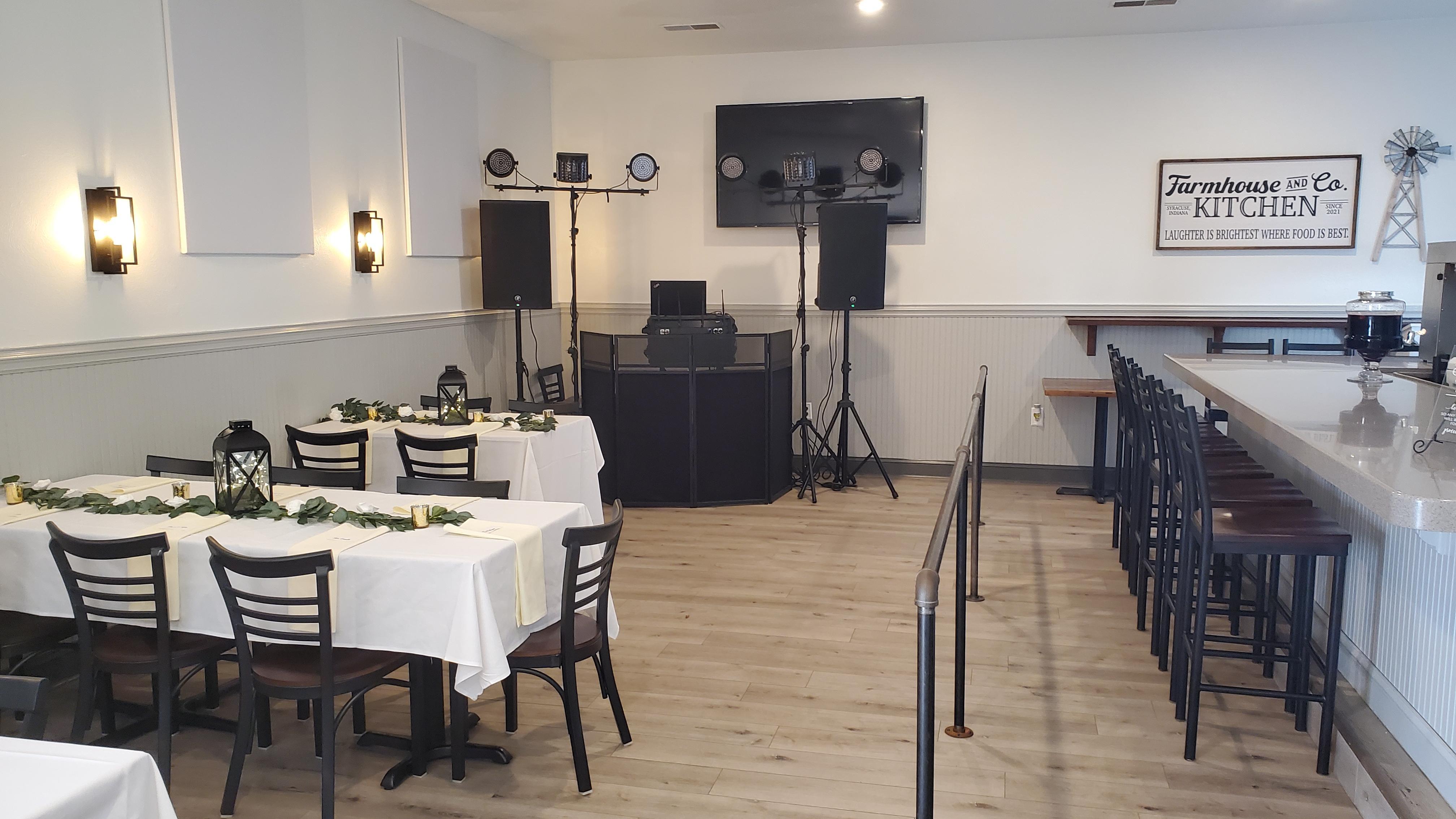 A private dining space with spacious bar, A/V capability, an outdoor bistro patio and spacious backyard, Farmhouse is an ideal spot for rehearsal dinners and family celebrations. Our venue is 100% private - so the space is ALL YOURS. We are located just 0.3 miles from Blue Barn, so many of our wedding couples utilize this space for their rehearsal dinner after the evening-before ceremony walk-through.