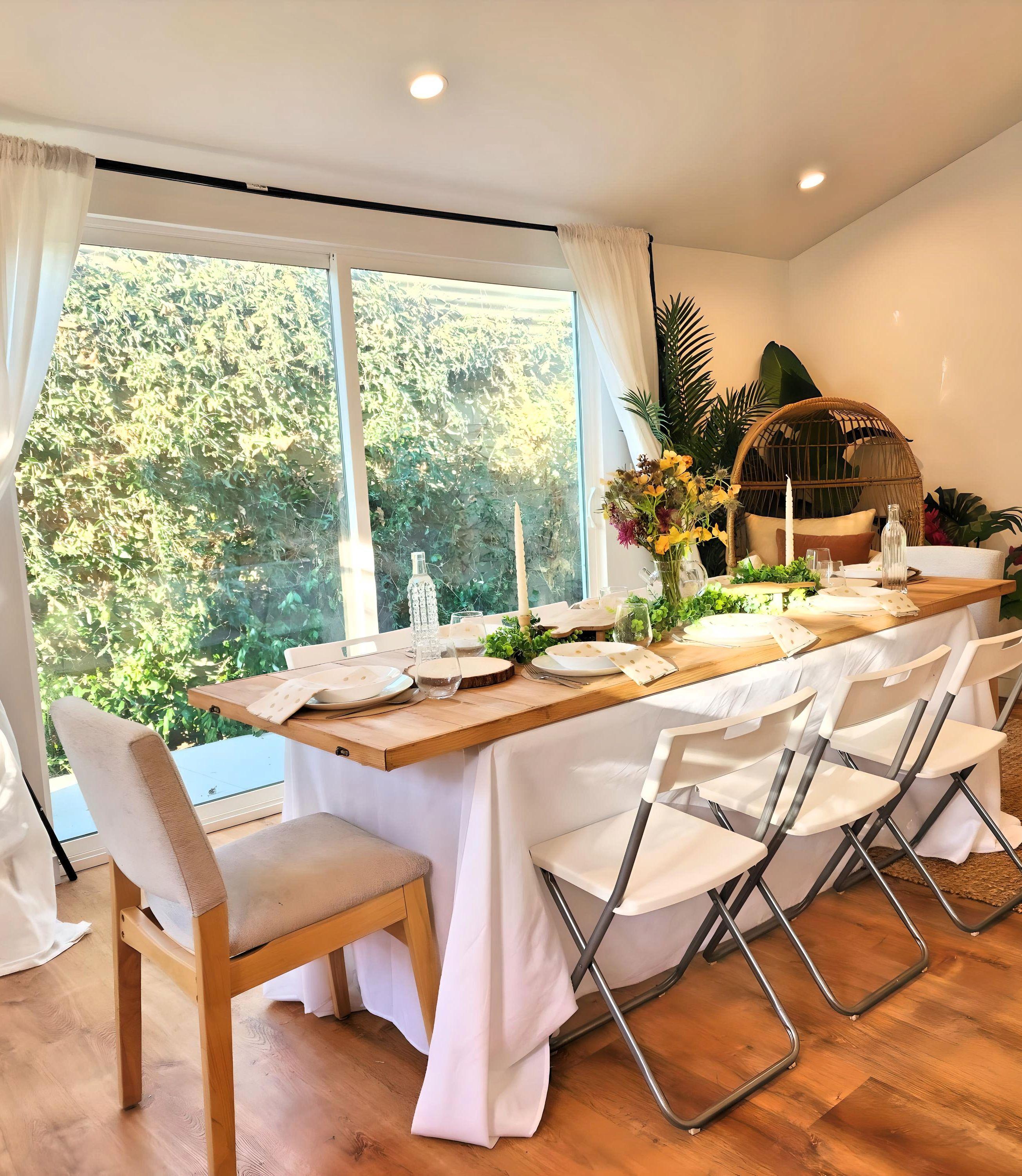 Dimmers for customizable lighting Full kitchen for prep, cooking, and food display Full bathroom, including laundry if needed Coffee and tea making station Backdrop to enhance photoshoot ambiance Instagrammable setting to capture beautiful moments Outdoor lights for ambiance Tables & chairs included Tablecloths (if requested) Dinnerware (if requested)