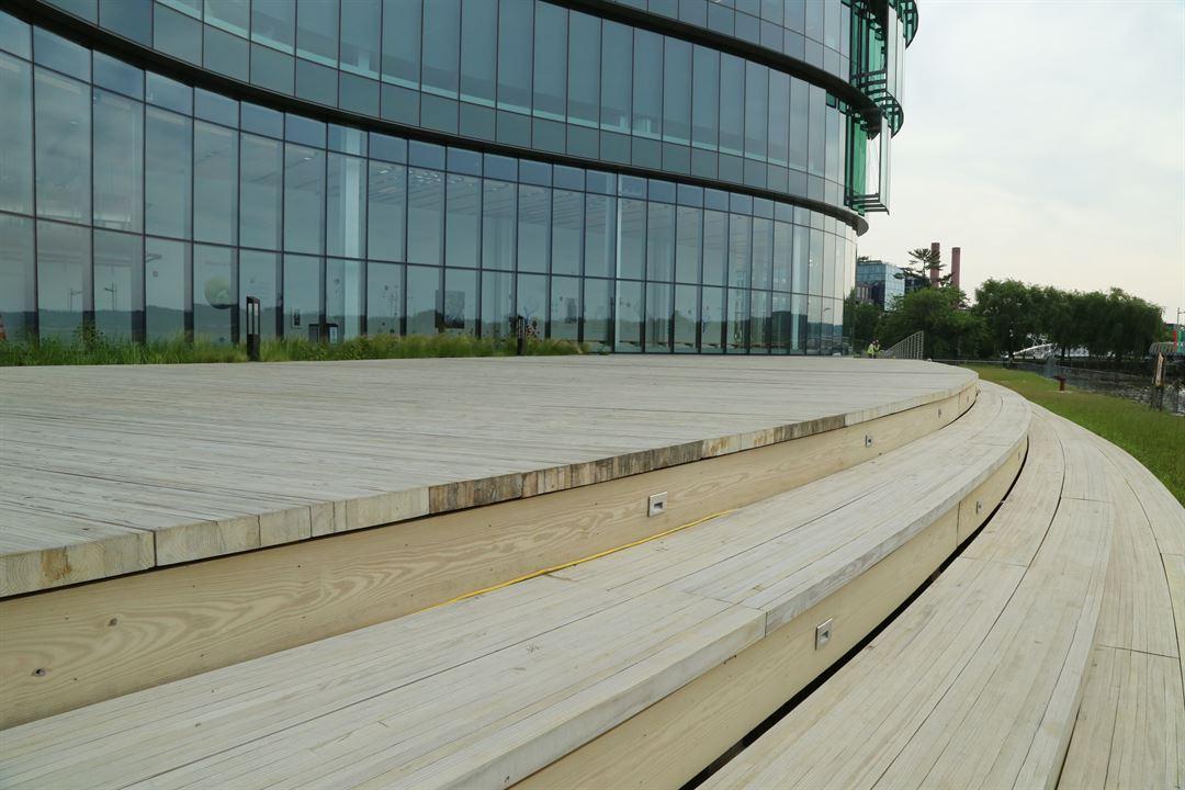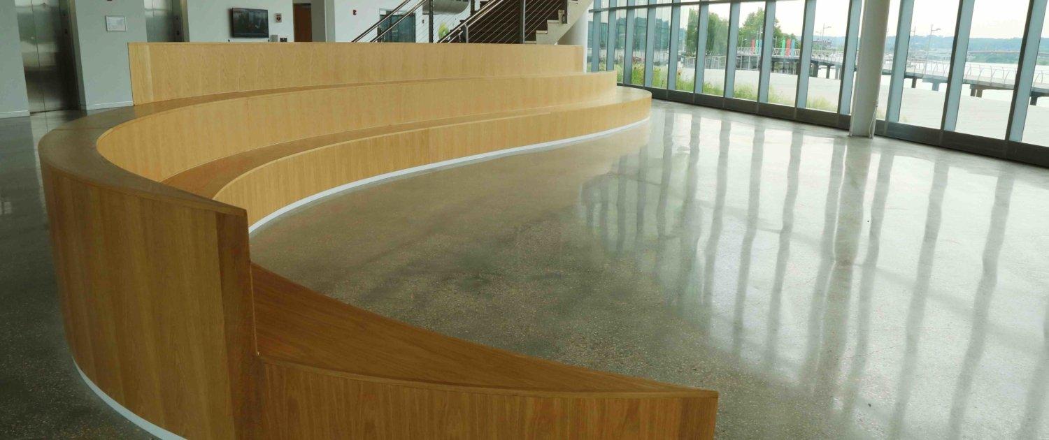 The 13,270 square foot lobby wraps around the building leading to a rotunda. The walls of the open entryway describe the unique design of the space. This area is great for receptions, happy hours, dancing and short programs in the rotunda. It can accommodate up to 200 people. HQO was built around an existing pump station, creating its unique shape. There are several cut-outs into the pump station throughout the lobby.Enjoy beautiful views of the water from the patio and scan the horizon for wildlife–you may even see a bald eagle or osprey. The landscaping is native to the area. It’s great for barbecues or seated meals and both informal or formal events. This space accommodates up to 200 seated guests.