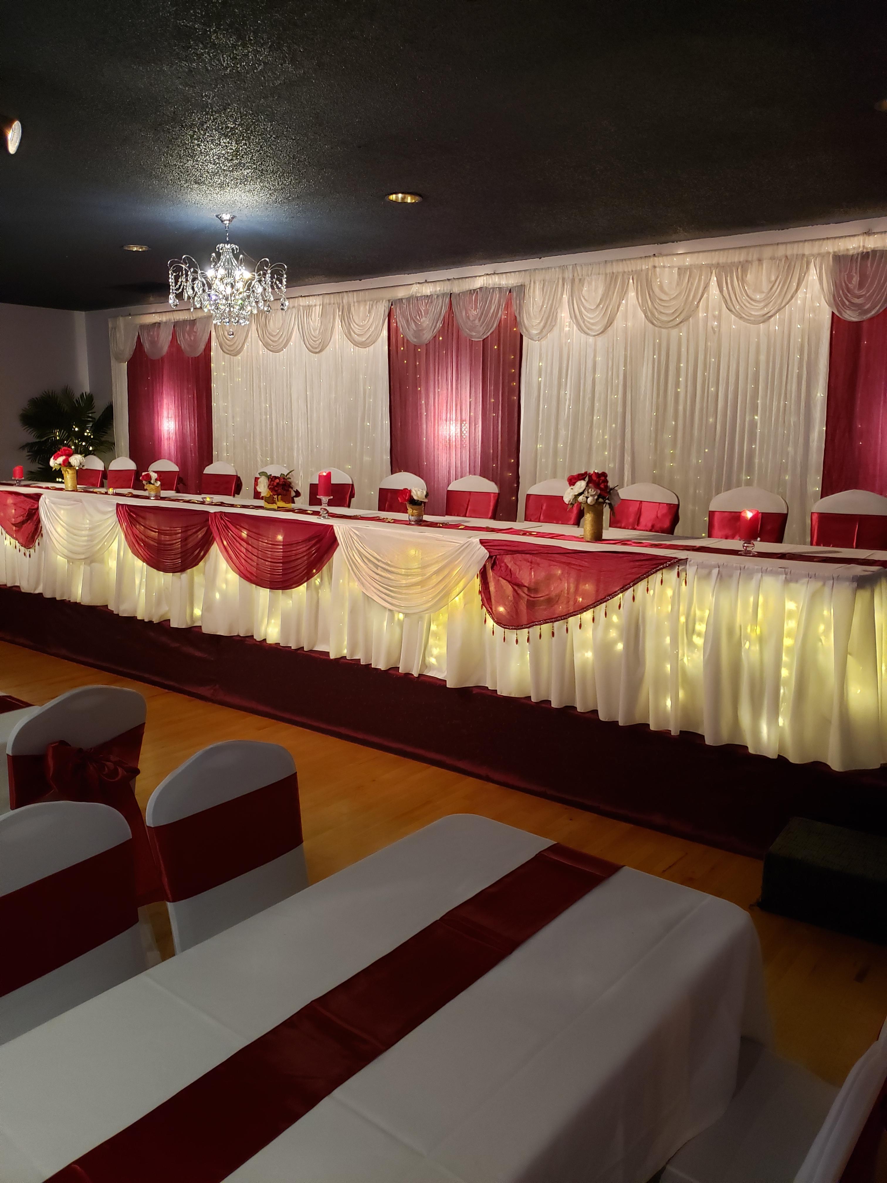 This space features a 2500 sq ft ballroom area with a 1200 ft overflow seating area, full bar service set up, buffet room, arched sealing, ambiance lighting, fantastic HVAC system, state if the art sound system for our recommended DJs