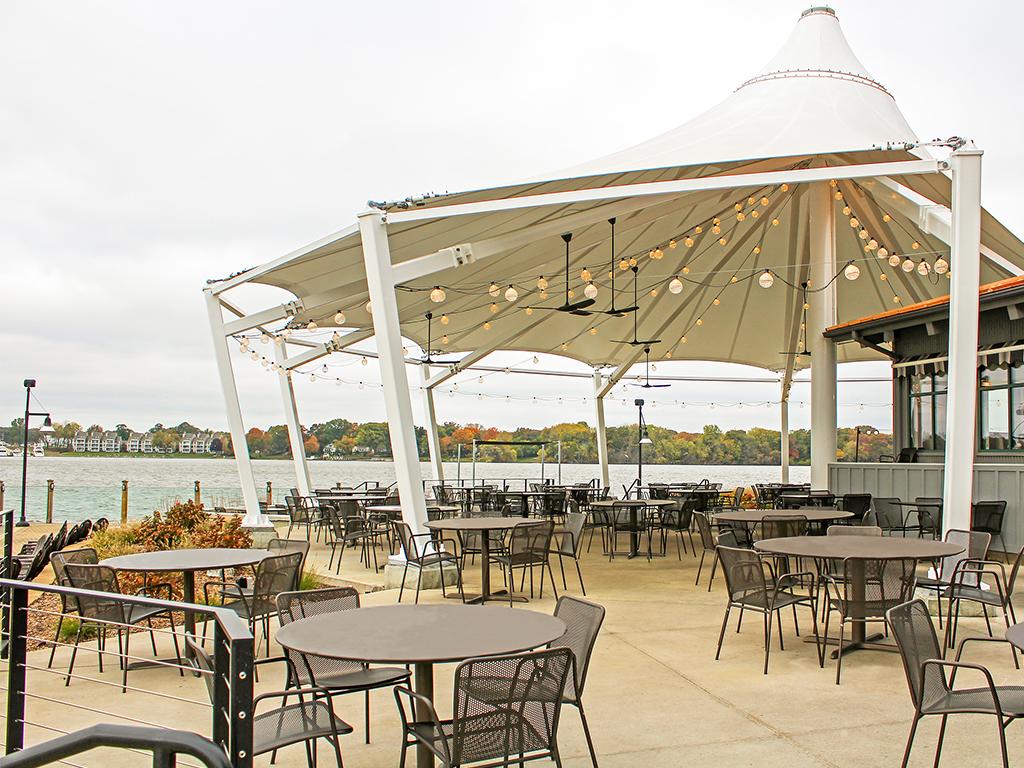 Built-in bar, patio, retractable wall windows, bridal suite (extra fee), wedding ceremony arch, lawn games, fire pit, tiki torches, white resin chairs, patio with views of Lake Macatawa.
