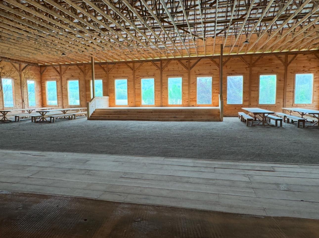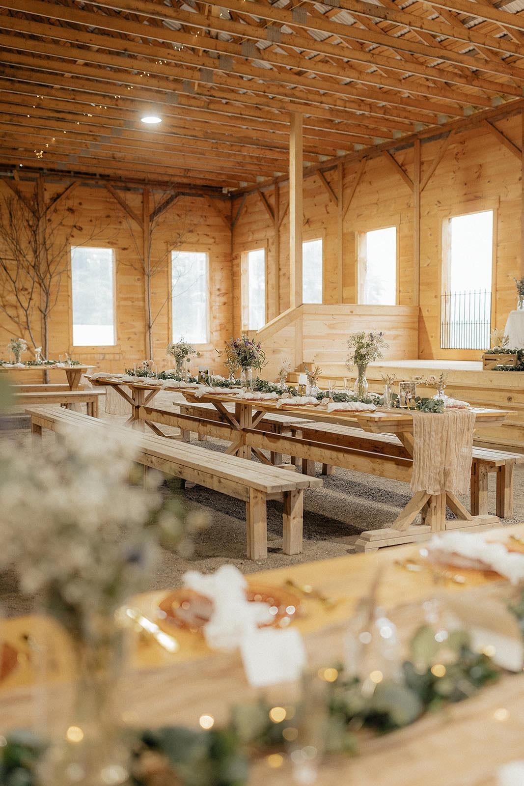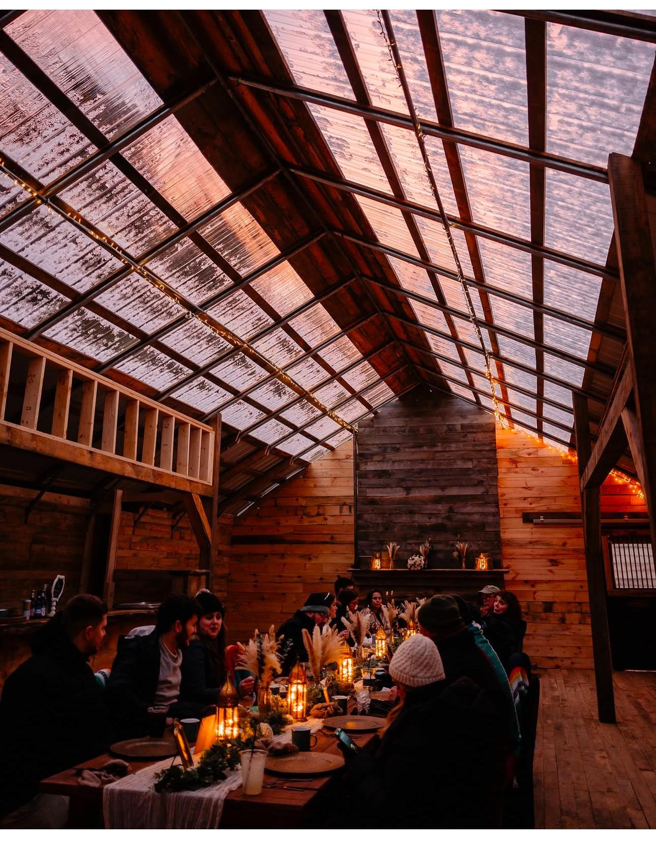 The main event space is a 5,000 sq ft timberframe building with a 32' live edge bar. Sixteen foot Farmhouse Tables and Bar Service are included in the venue fee. Large windows with natural light with beautiful views of the Western Foothills of Maine.