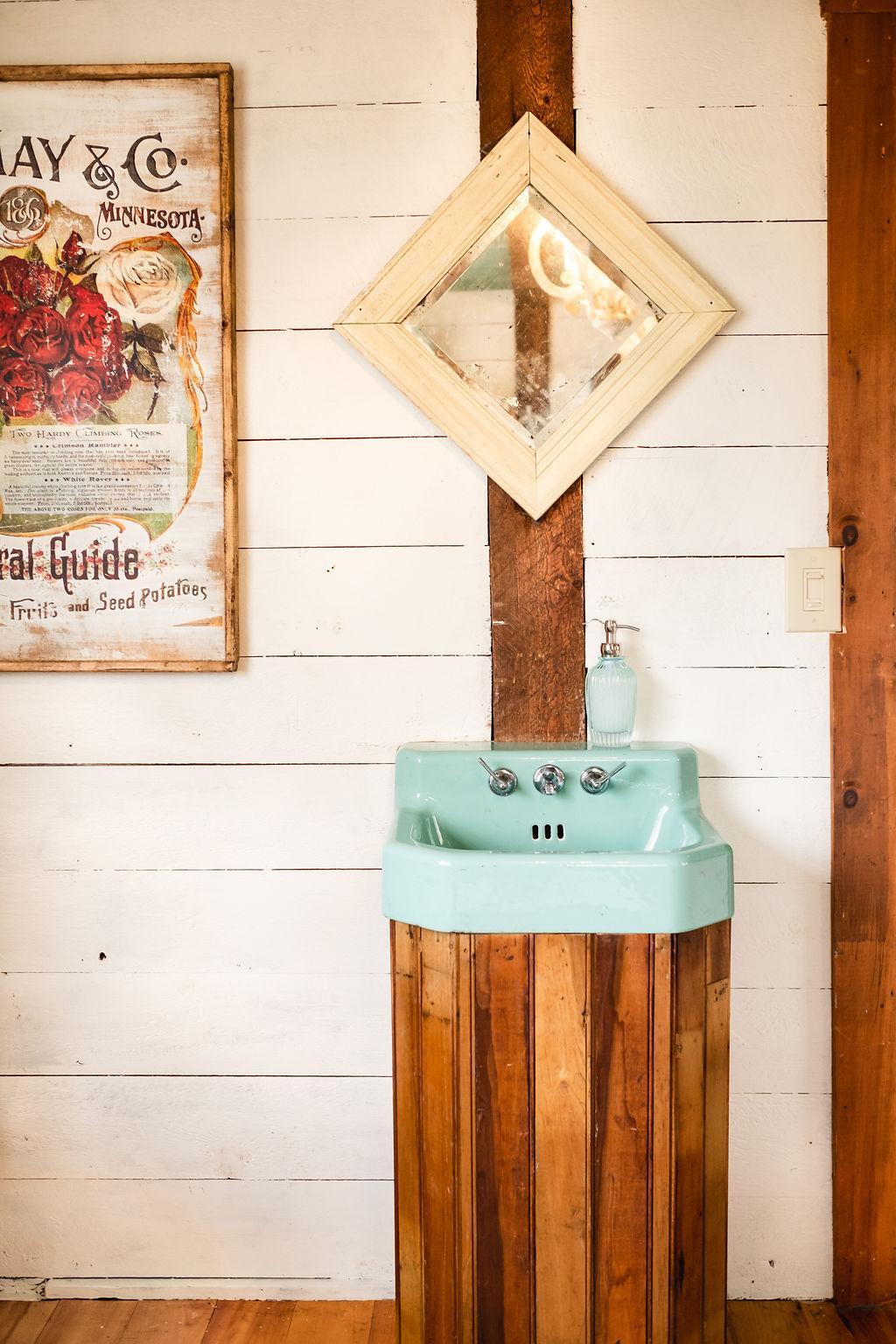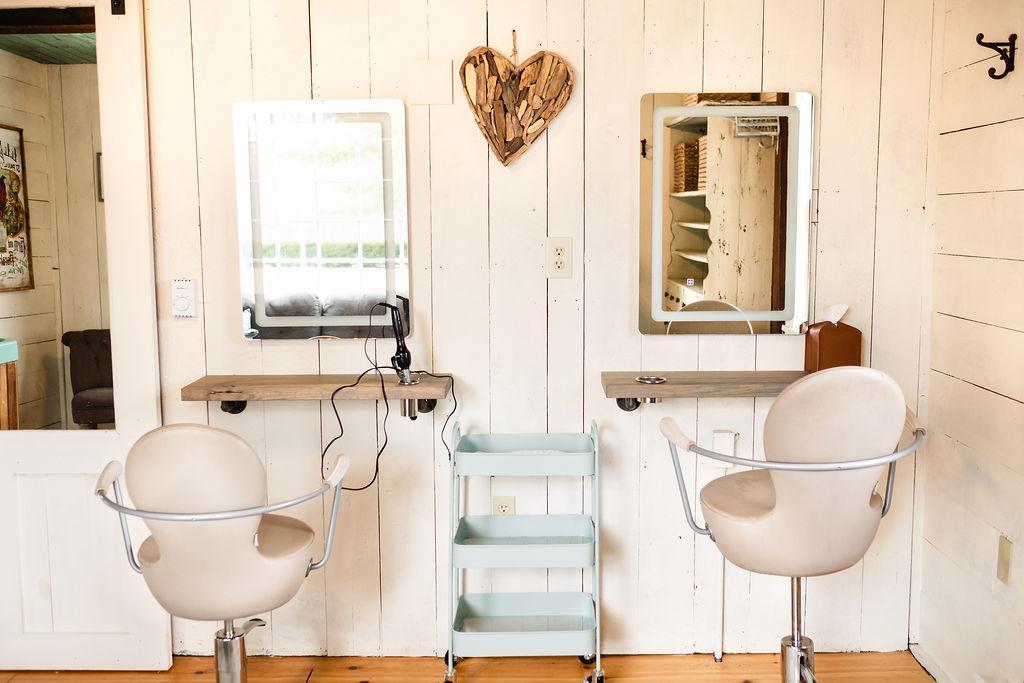 *Midcentury salon chairs *Ring light salon mirrors *Sofa and chairs *Apothecary cabinet *Sink *Large mirrors *Picture window *Air conditioning and heat