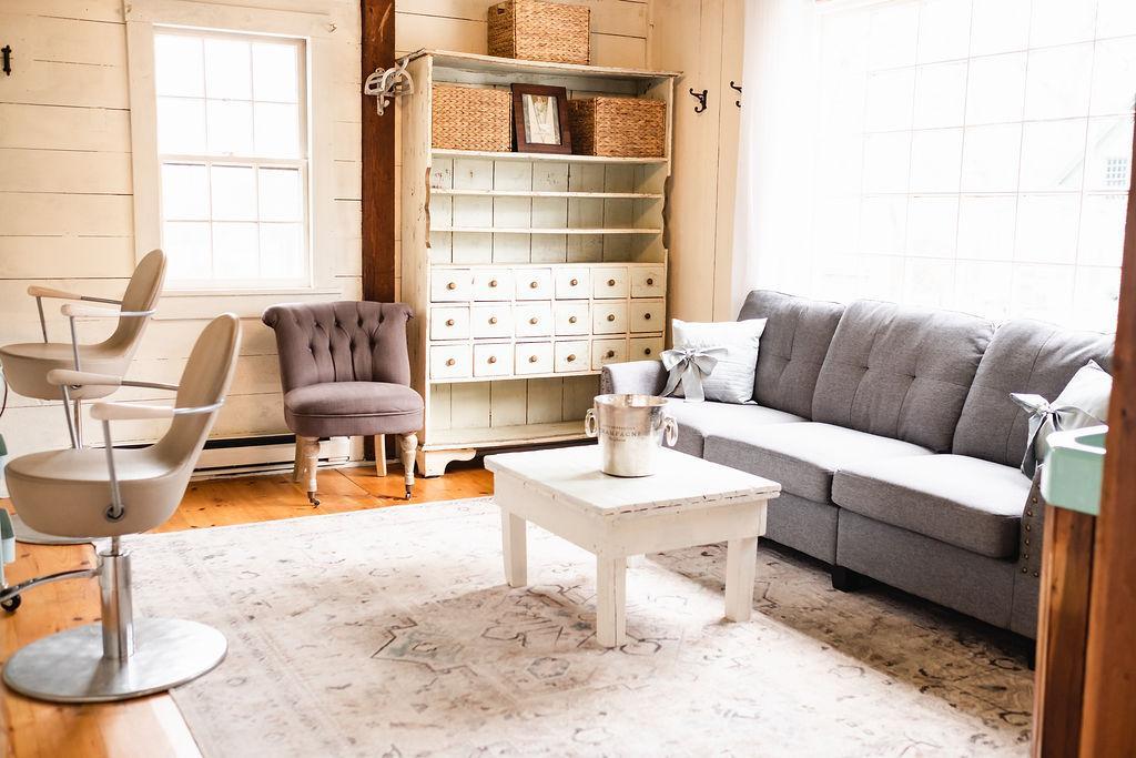This space features salon chairs and mirrors, seating, antique apothecary cabinet.