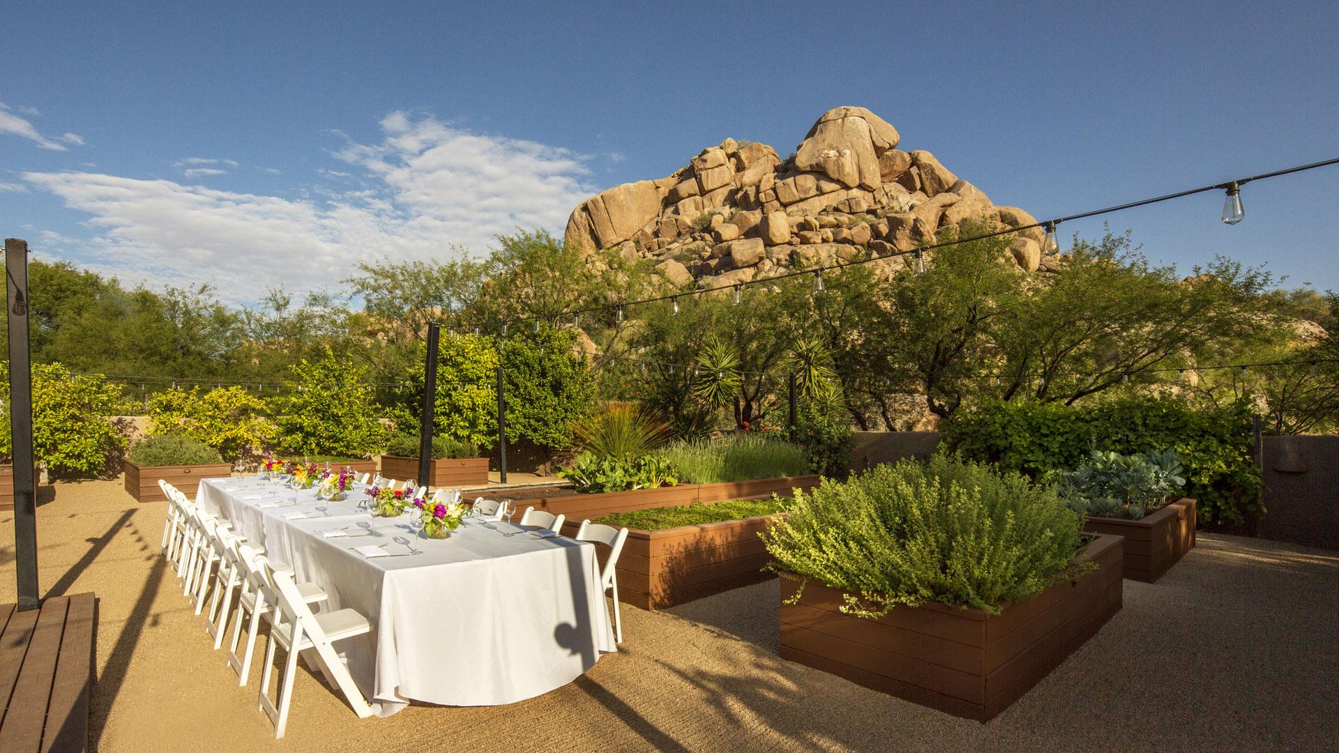 An intimate outdoor space where a spectacular desert sunset casts a warm glow on the ancient boulder formations that rise at the garden’s edge, this venue boasts a water feature, a reflection pond, and the fragrance of fresh herbs.