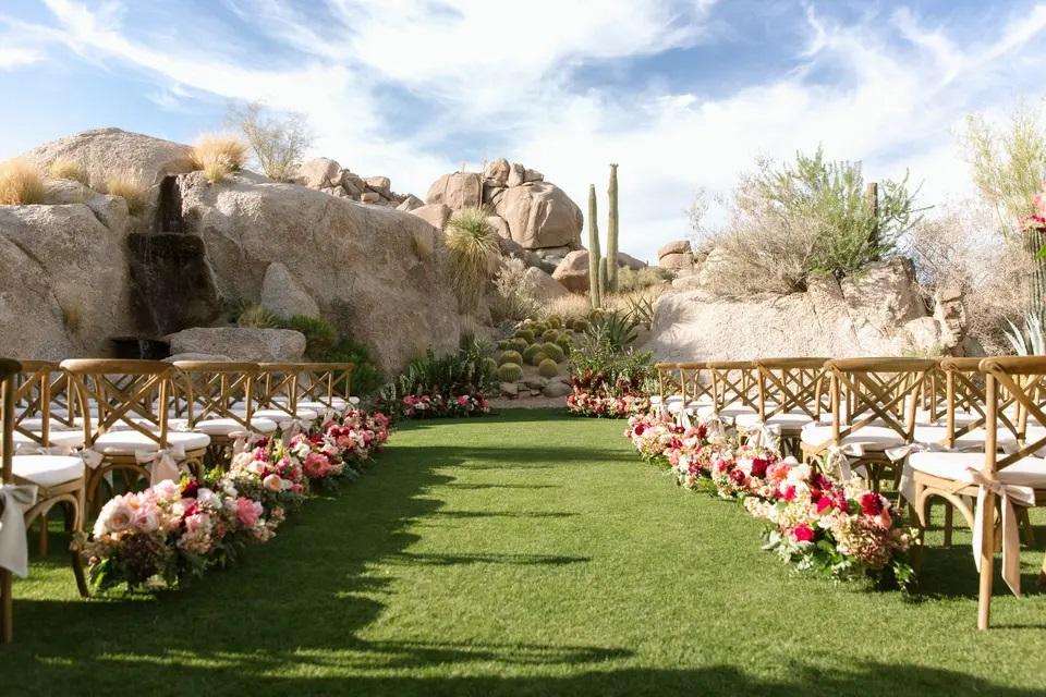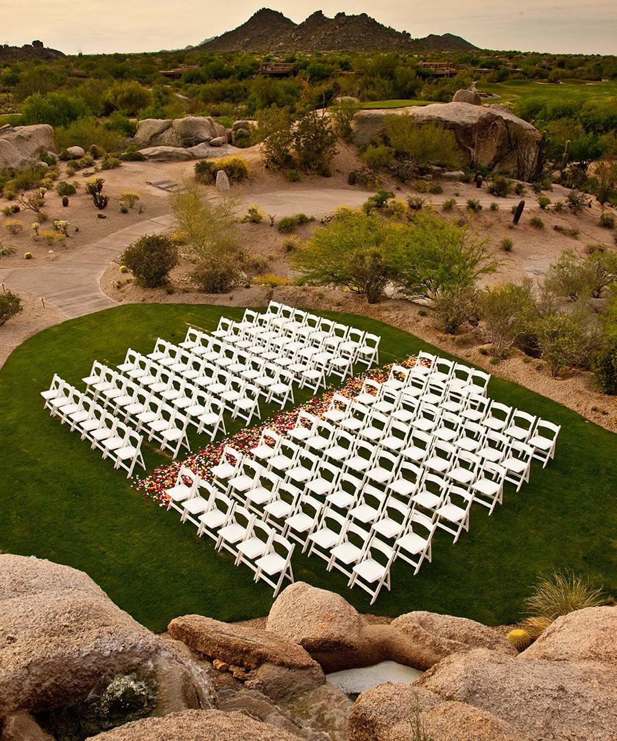 An intimate location surrounded by boulders, this unique site was created by nature and is graced by a cascading waterfall, grassy knolls, and saguaro cacti. Don’t be surprised if rabbits and quail join your well-wishers!
