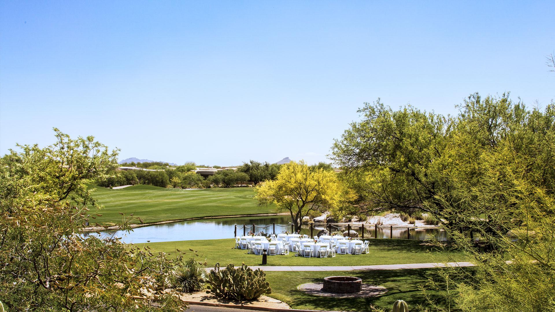 Located at the Boulders Golf Club, the 19th Green provides a tranquil setting surrounded by gorgeous greens, breathtaking views of the Pinnacle Peak mountain preserve in the distance, and the 18th fairways on both of the award-winning Boulders North and South Golf Courses.