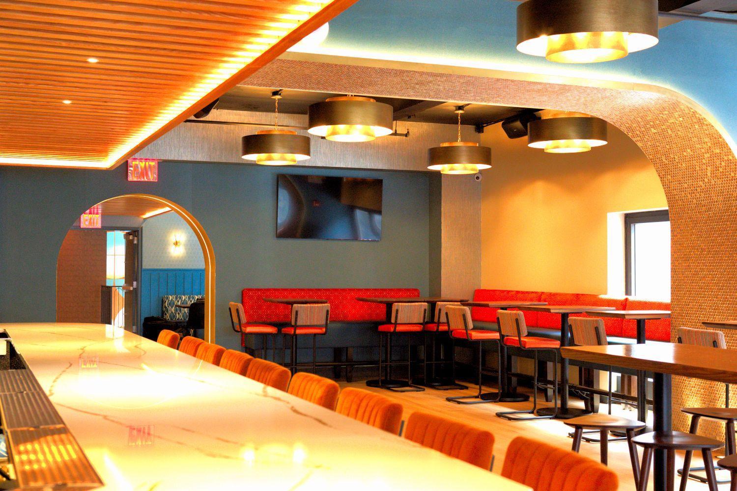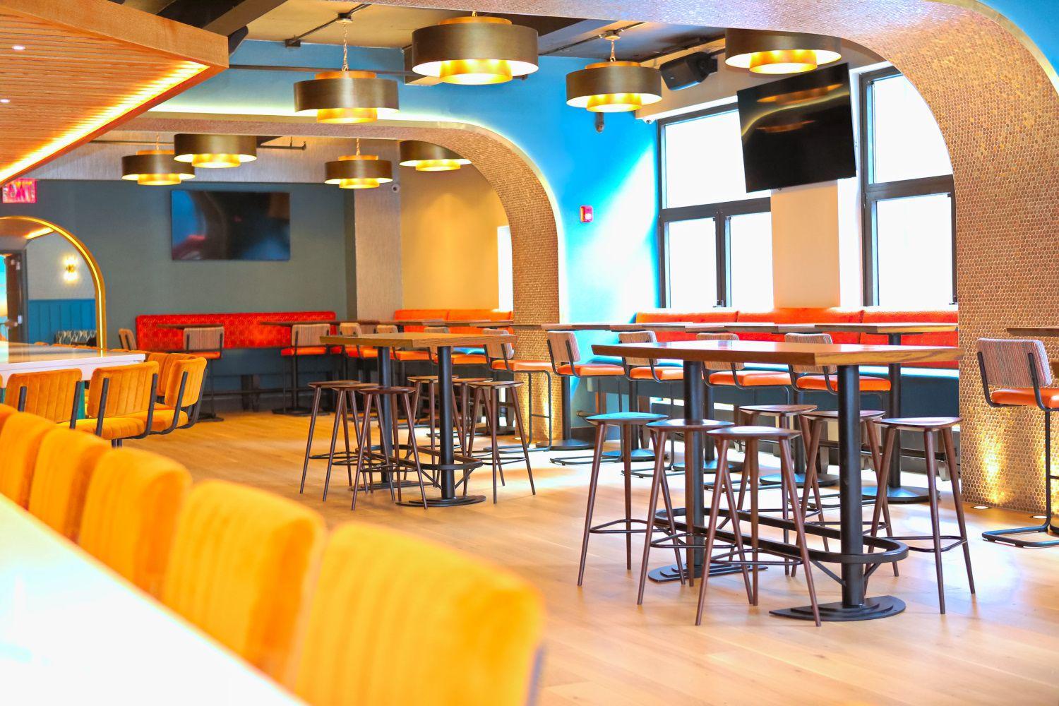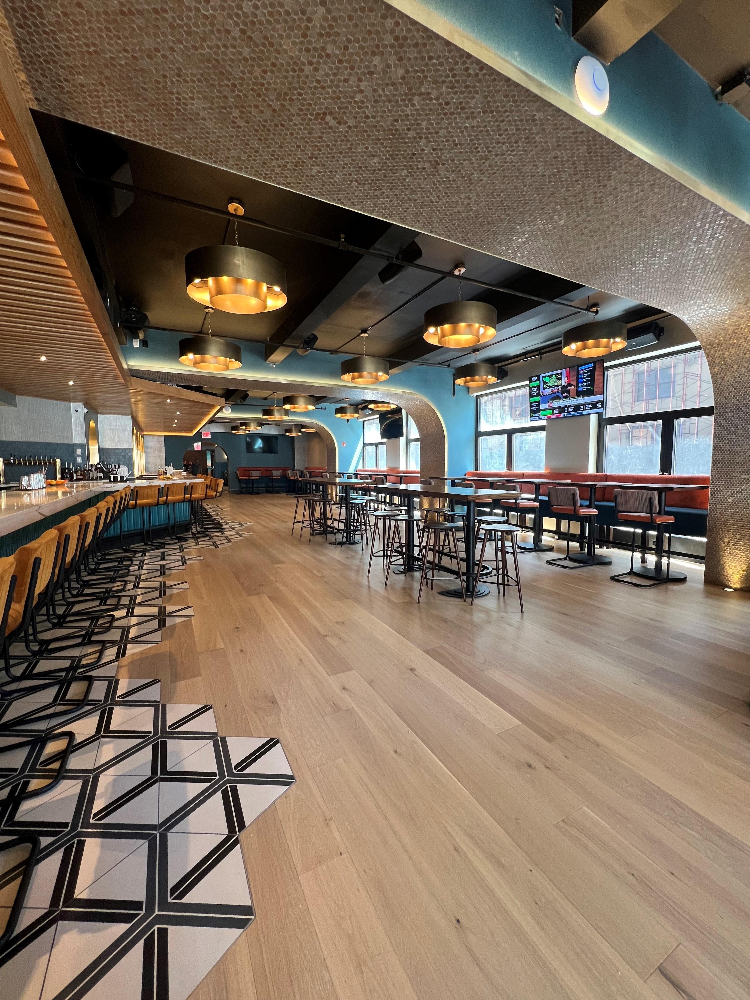 This space can hold up to 125 guests with private bathrooms, full 65 ft long bar, AUX capabilities, banquet style high top tables - perfect for a mix and mingle style event