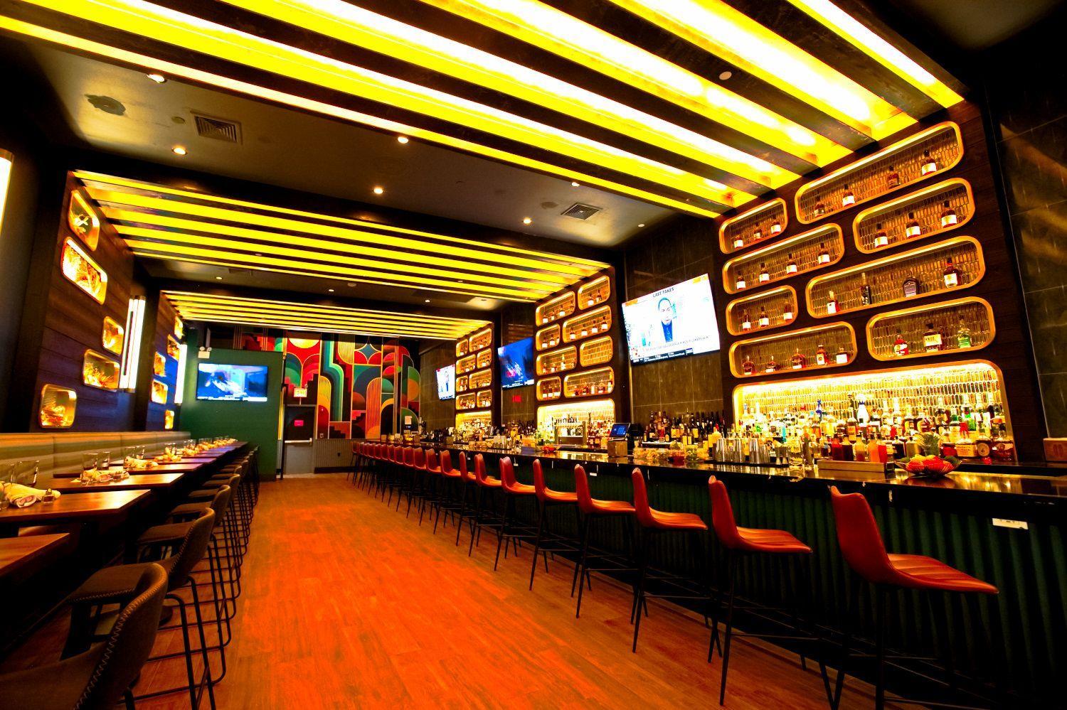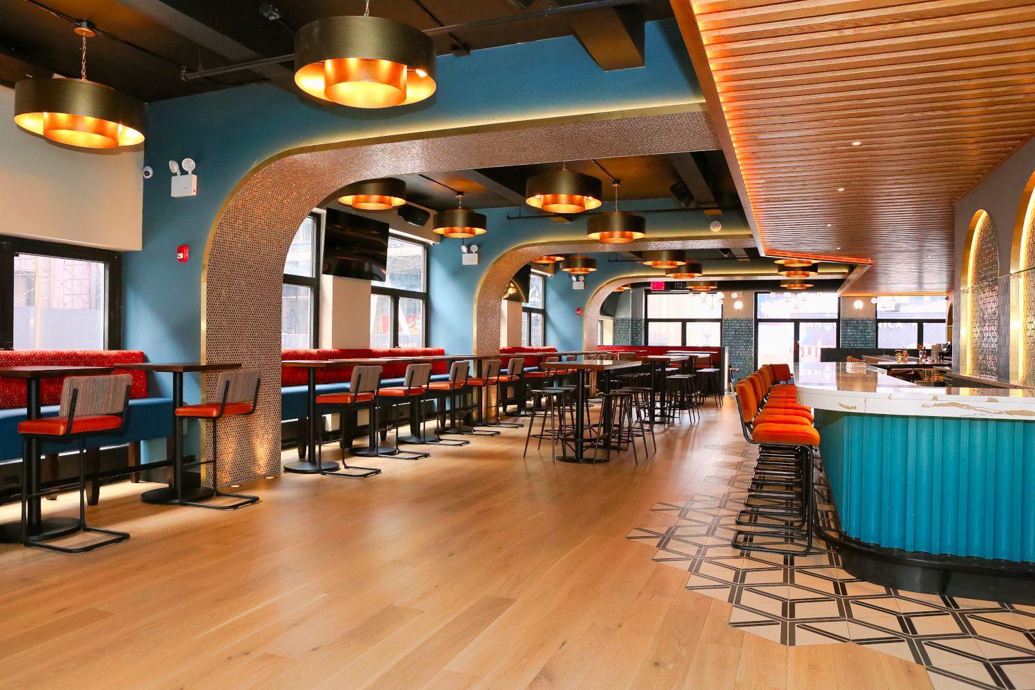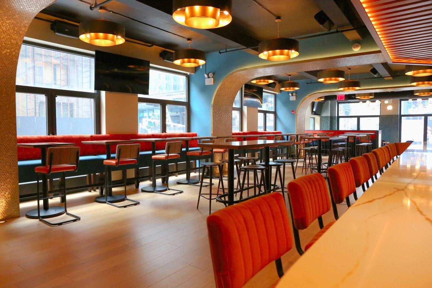 The entire second floor can be accessed via private stairs OR elevator and comes with a 55 ft long bar, combination of high tables and low tables, panoramic view of 7th Ave facing MSG. 9 televisions, AV capabilities and private bathrooms.