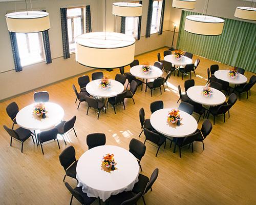 Welcome to the perfect space for your party or reception. Wedding events, dances, birthday, and anniversary parties are just some of the many possible uses for this beautiful room. In conjunction with this large space, you could also rent the licensed kitchen which is conveniently located off the east end of the Ballroom. Extend your space for really big events by booking the adjoining West and North Ballrooms. This room is 31′ x 51′ (~1580 sf.). Capacity: 72 w/ tables, 100 w/ presentation seating, 120 standing