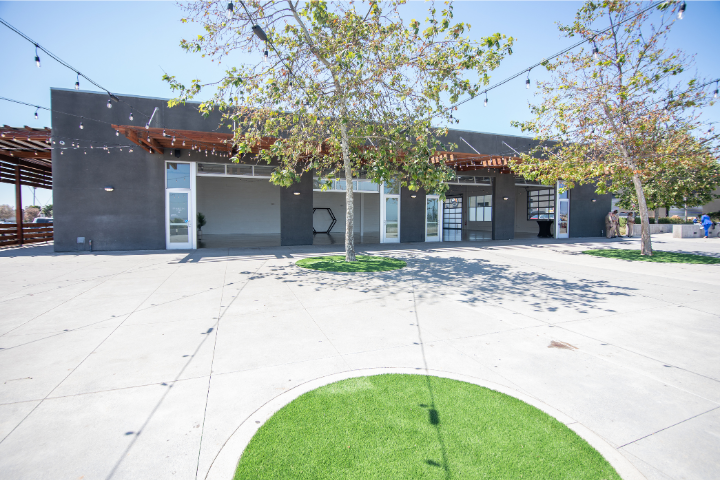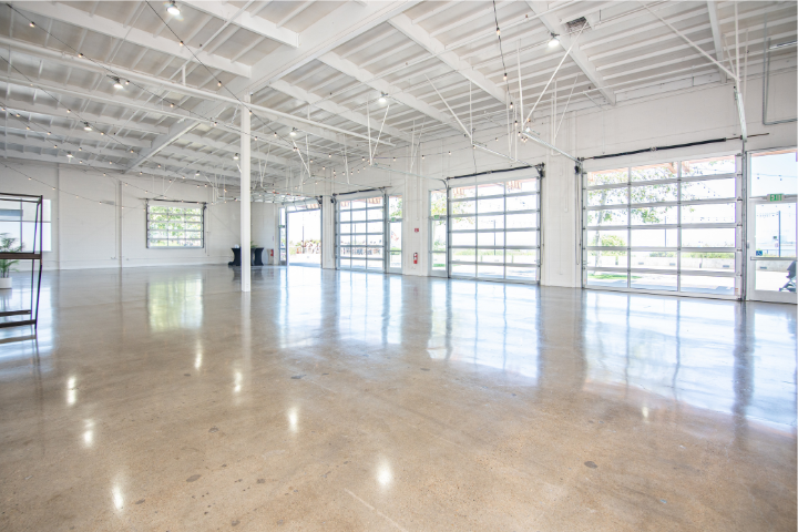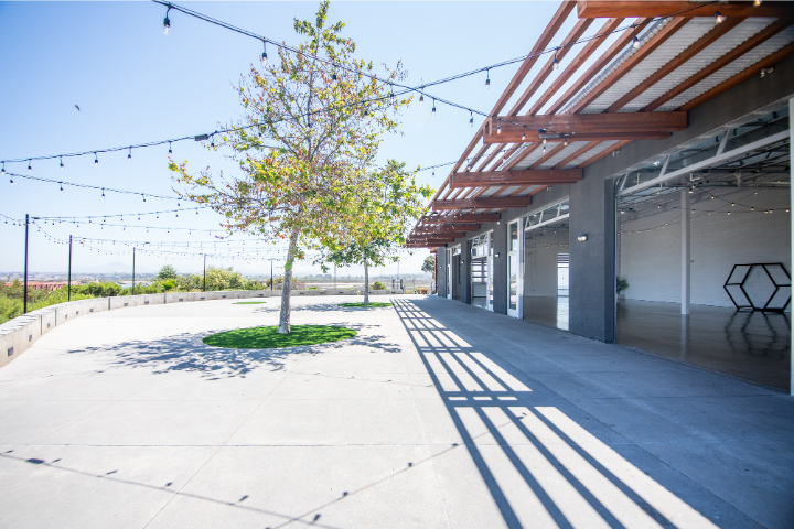 This patio is perfect for cocktail hour & festivities. There is nothing like having the flexibility to flow indoor and outdoor through 5 roll-up doors. The space offers a perfect transition from wedding ceremony to festive cocktail hour where the indoor space is blocked out and then transitions into the interior space for banquet seating reception, dancing and festivities. The outdoor patio is equipped with electricity and market lights which make it easy for vendors and ambiance.