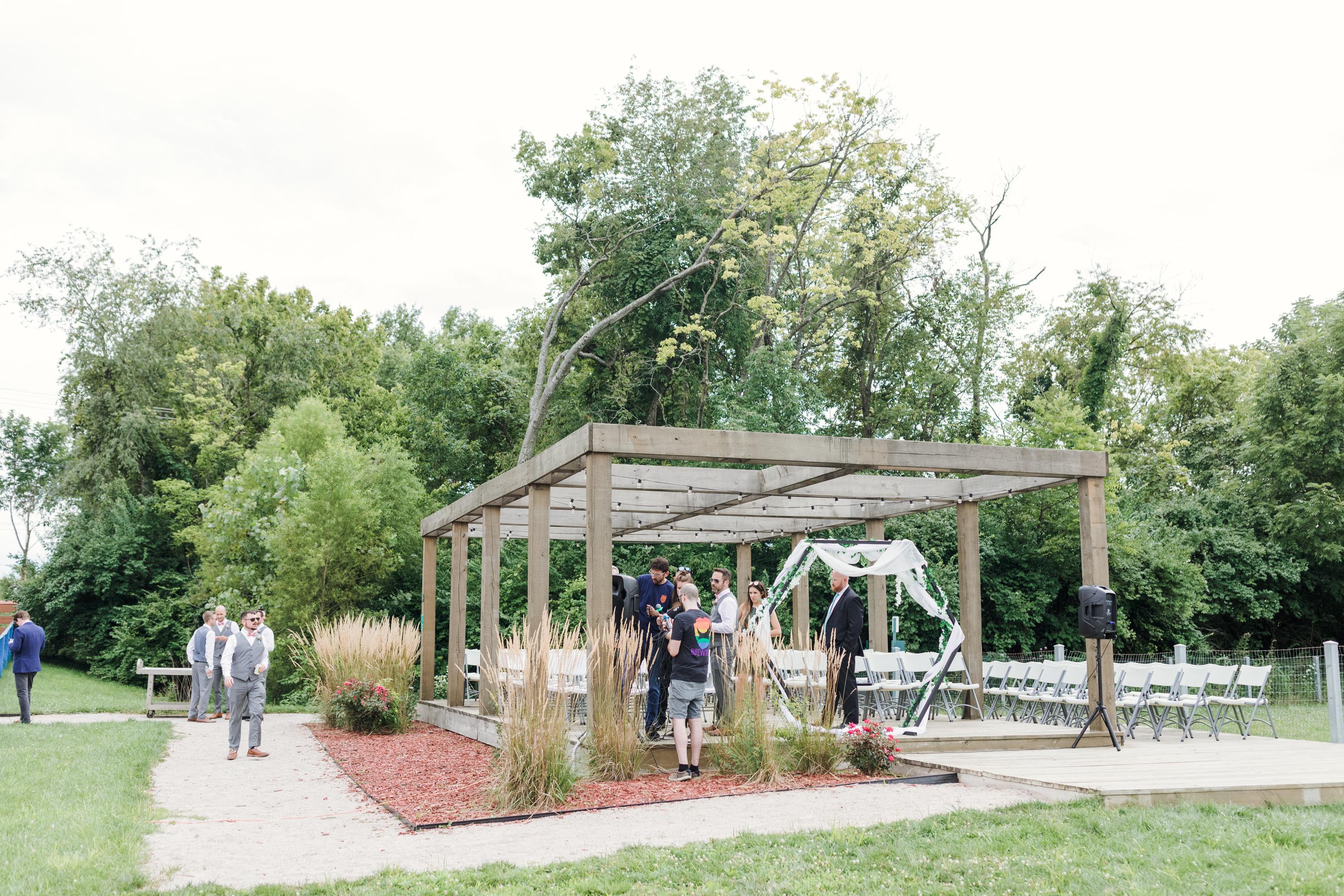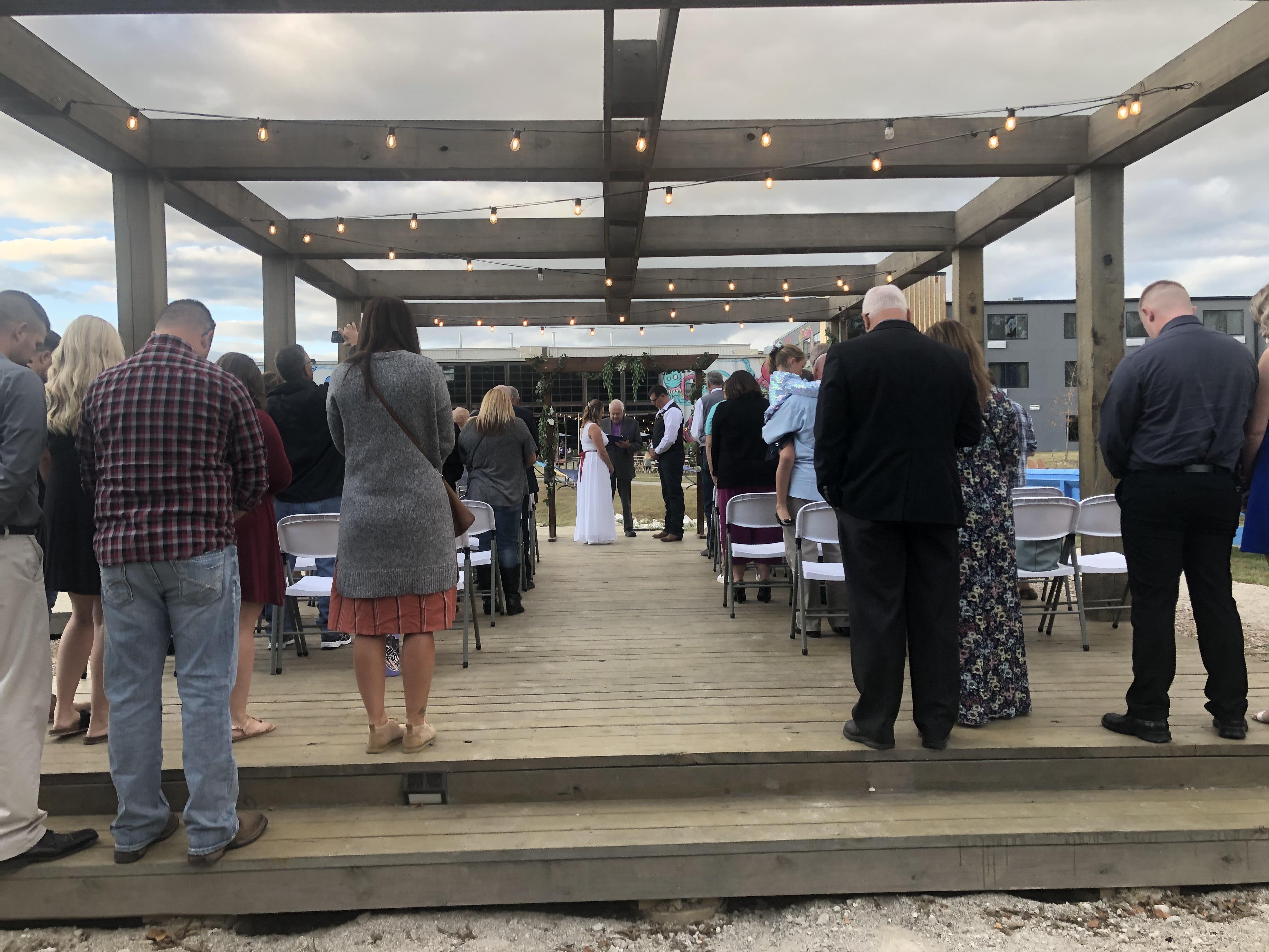 Large wood gazebo adjacent to the dog park. Create an aisle from the hotel or the trail and walk up to say "I Do." Select your own backdrop with an industrial look of the brewery or beautiful foliage. 90 seats fit in the space and more can be added on with using the green space in front of the gazebo.