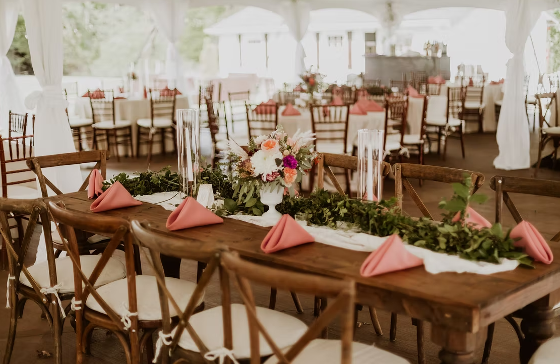 A classic celebration - 9 hour venue rental, ceremony & tent reception set-up, buffet catering, buttercream cake, DJ/emcee, bridal & ceremony florals, and access to Pinterest room