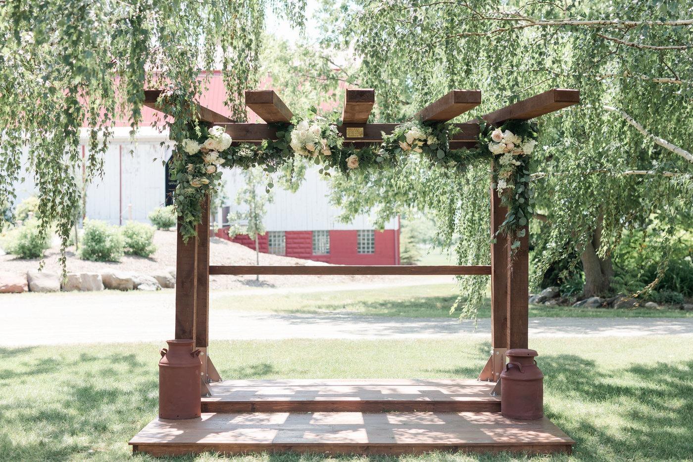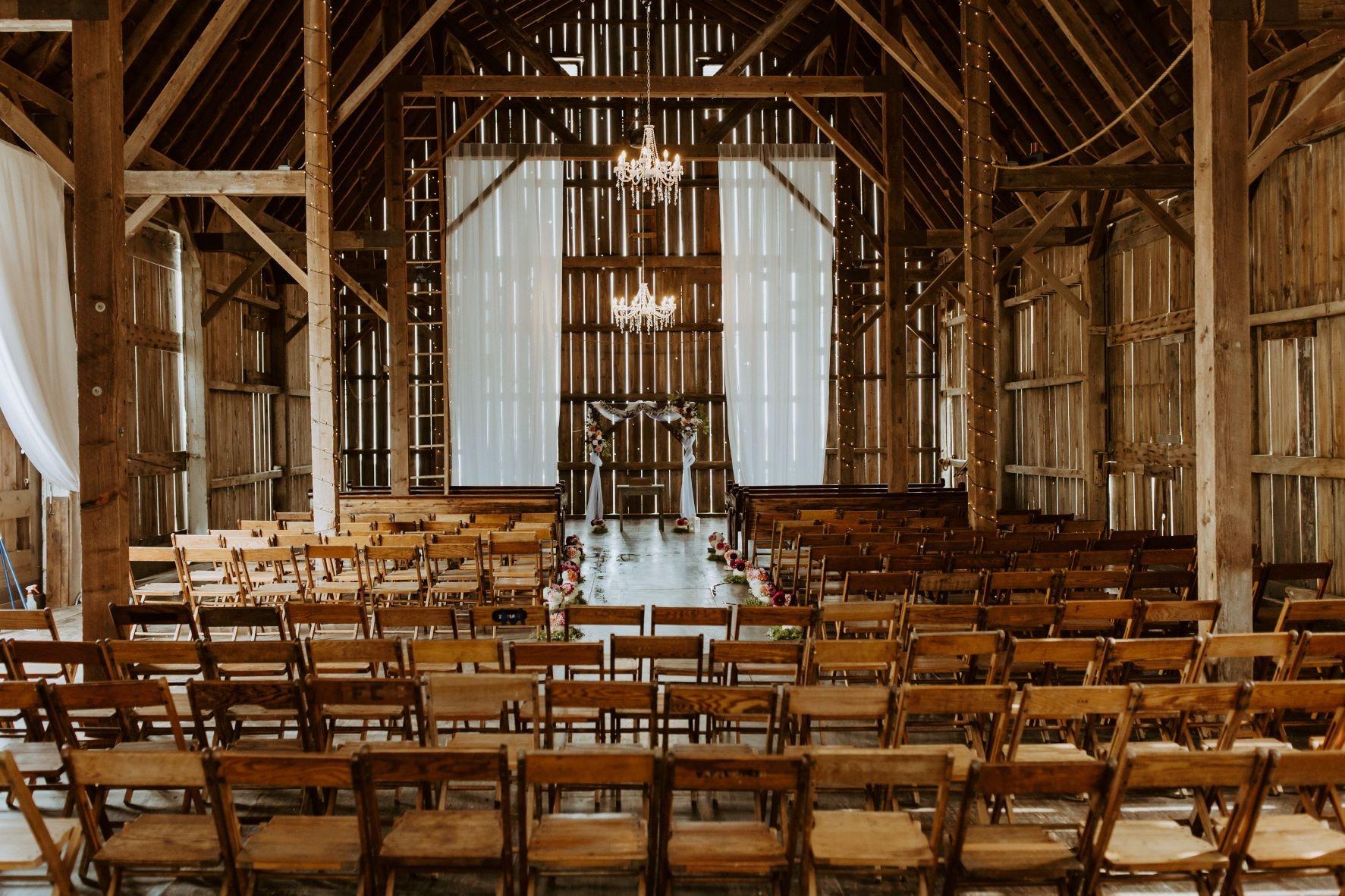 Two weeping birch trees accompanied by a backdrop of the barn make for a beautiful outdoor ceremony location