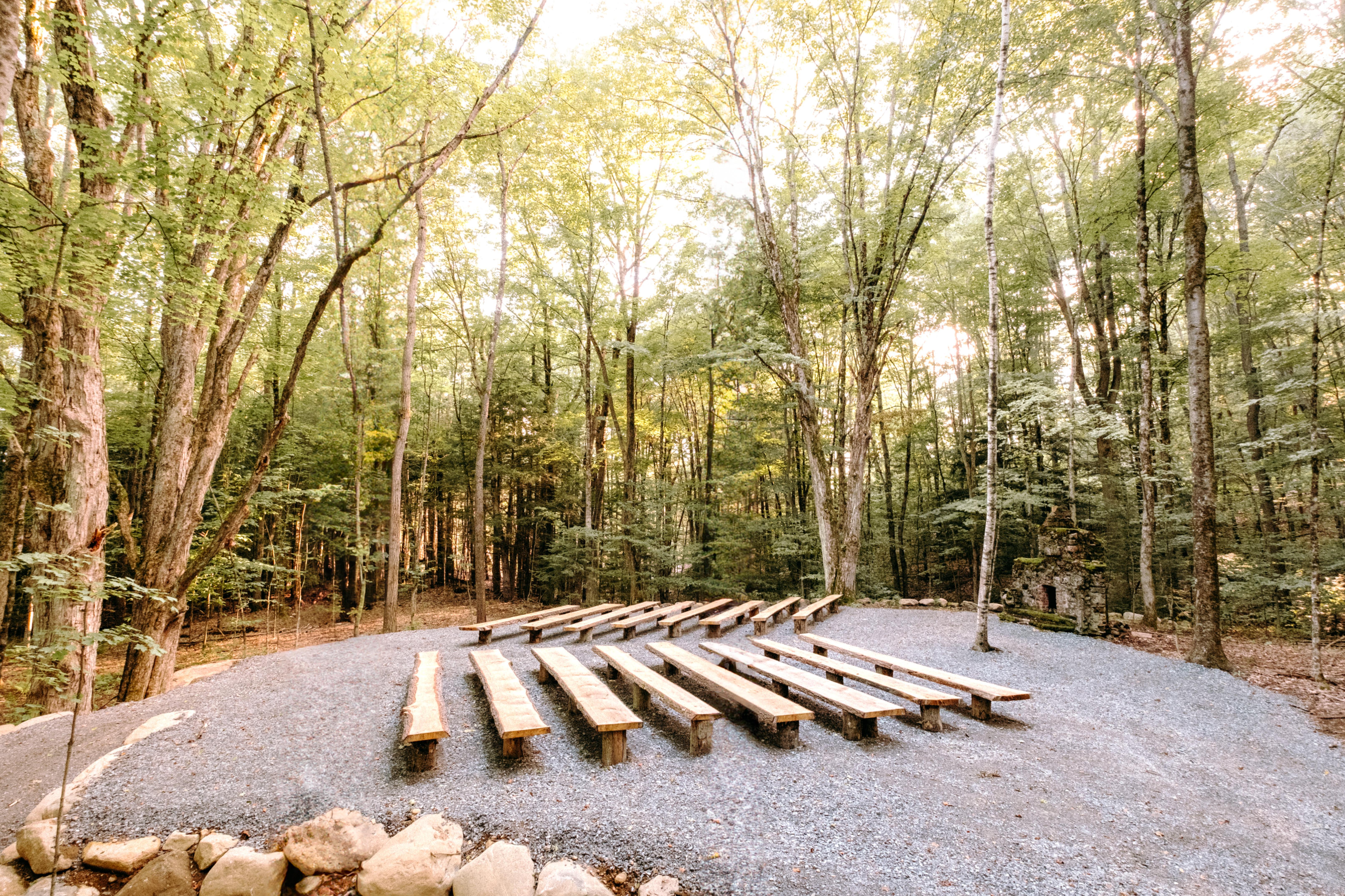 Camp Chapel offers a captivating woodsy ambiance, nestled amidst hardwood trees. The gentle murmur of a nearby stream adds a soothing soundtrack to this picturesque setting. An enchanting 1800s fireplace stands as a timeless centerpiece, exuding both warmth and historical charm. The seating arrangements are thoughtfully curated with custom wood benches, providing a rustic yet comfortable space for gatherings and shared moments amidst the serene beauty of nature.