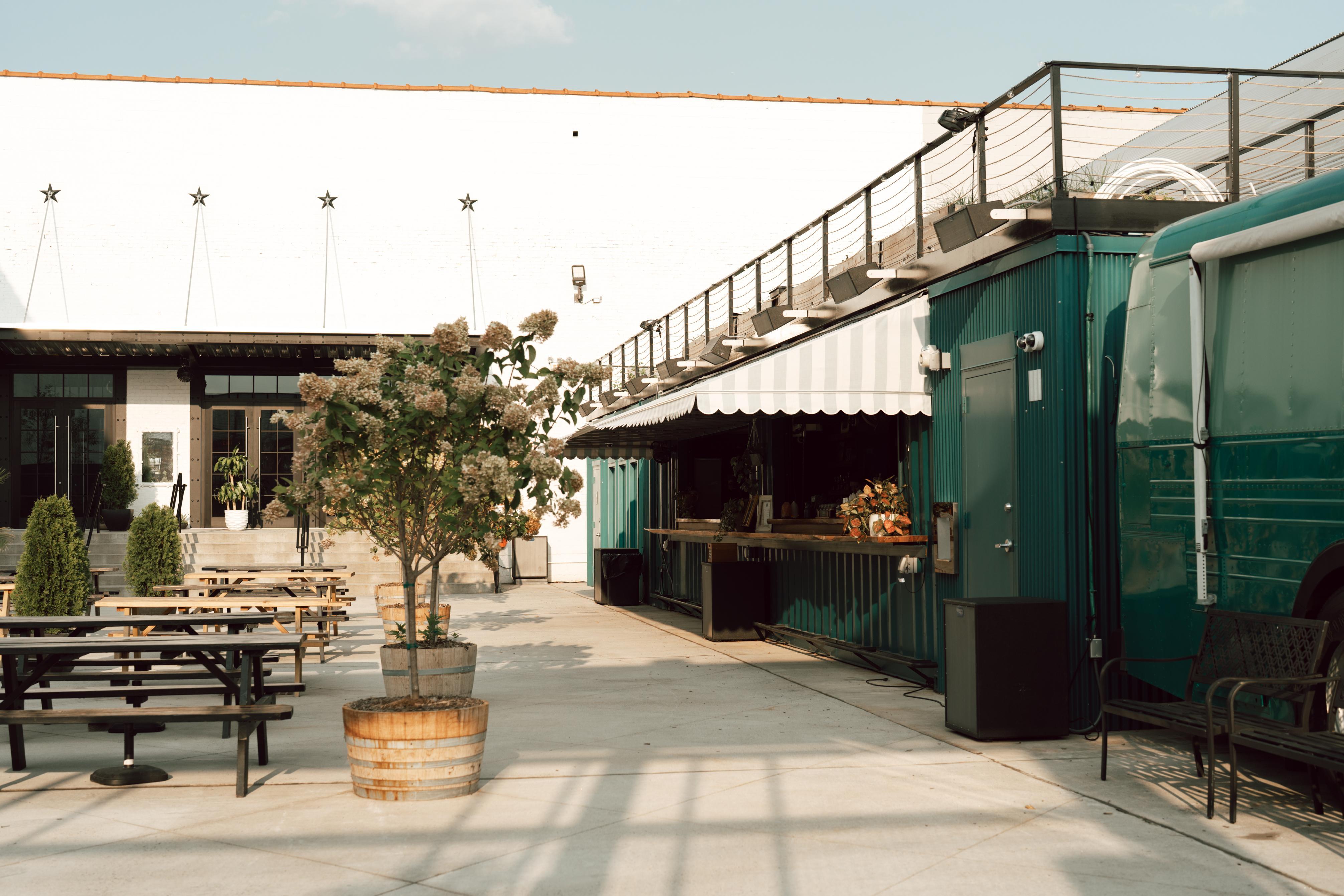 An outdoor oasis with a rooftop herb farm atop refurbished shipping containers. Beautiful reclaimed wood bars and a vintage bus add unique opportunities for customization. Perfect for gatherings wishing to bring a little nature into the big city.