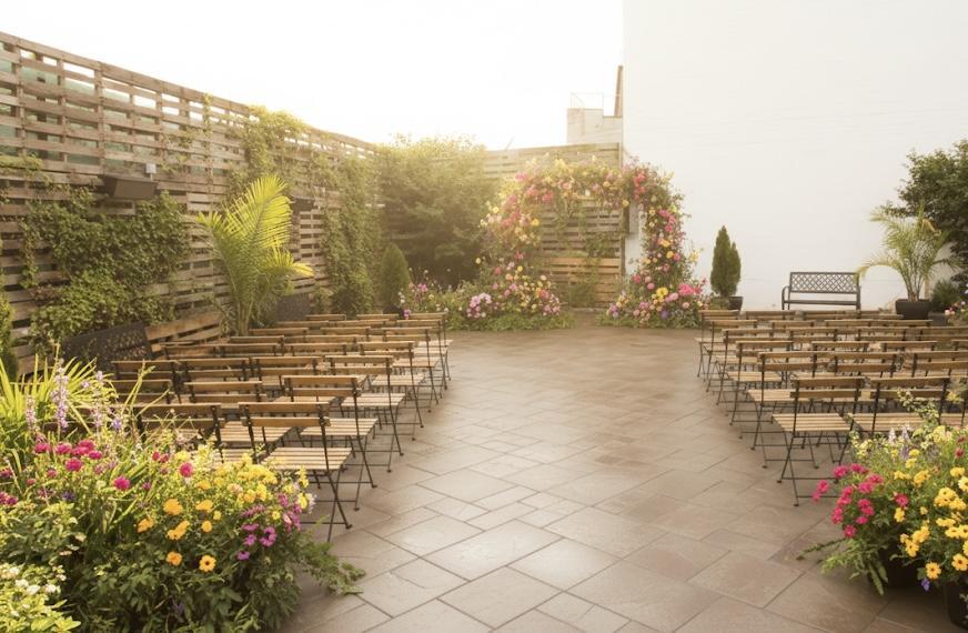 Sanctuary in the middle of Brooklyn, NY. Open space surrounded by lush greenery and reclaimed wood bars.