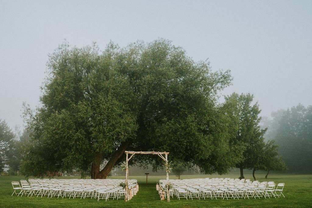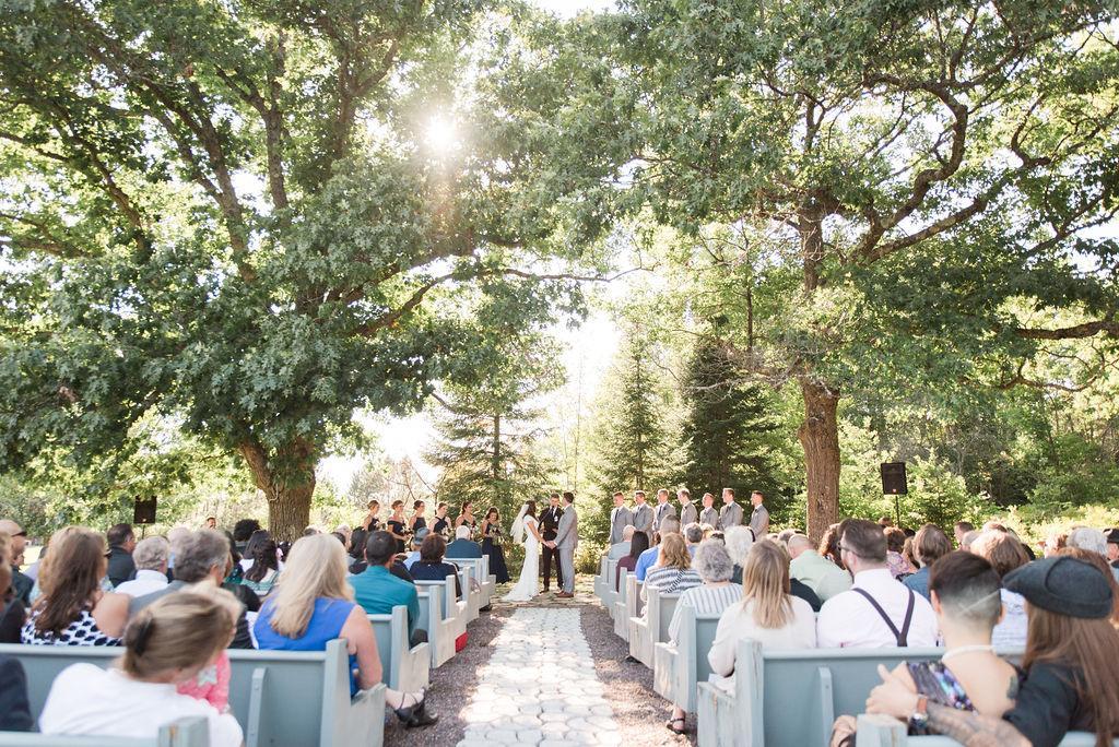 One of our newest ceremony sites, The Oaks is set against the back woodline under the branches of two huge oaks. The ceremony site includes pews and an entry arch and features slices of the Willow Tree carpeting the front. The afternoon light filters through the branches of the oaks to create the perfect shaded ceremony location.