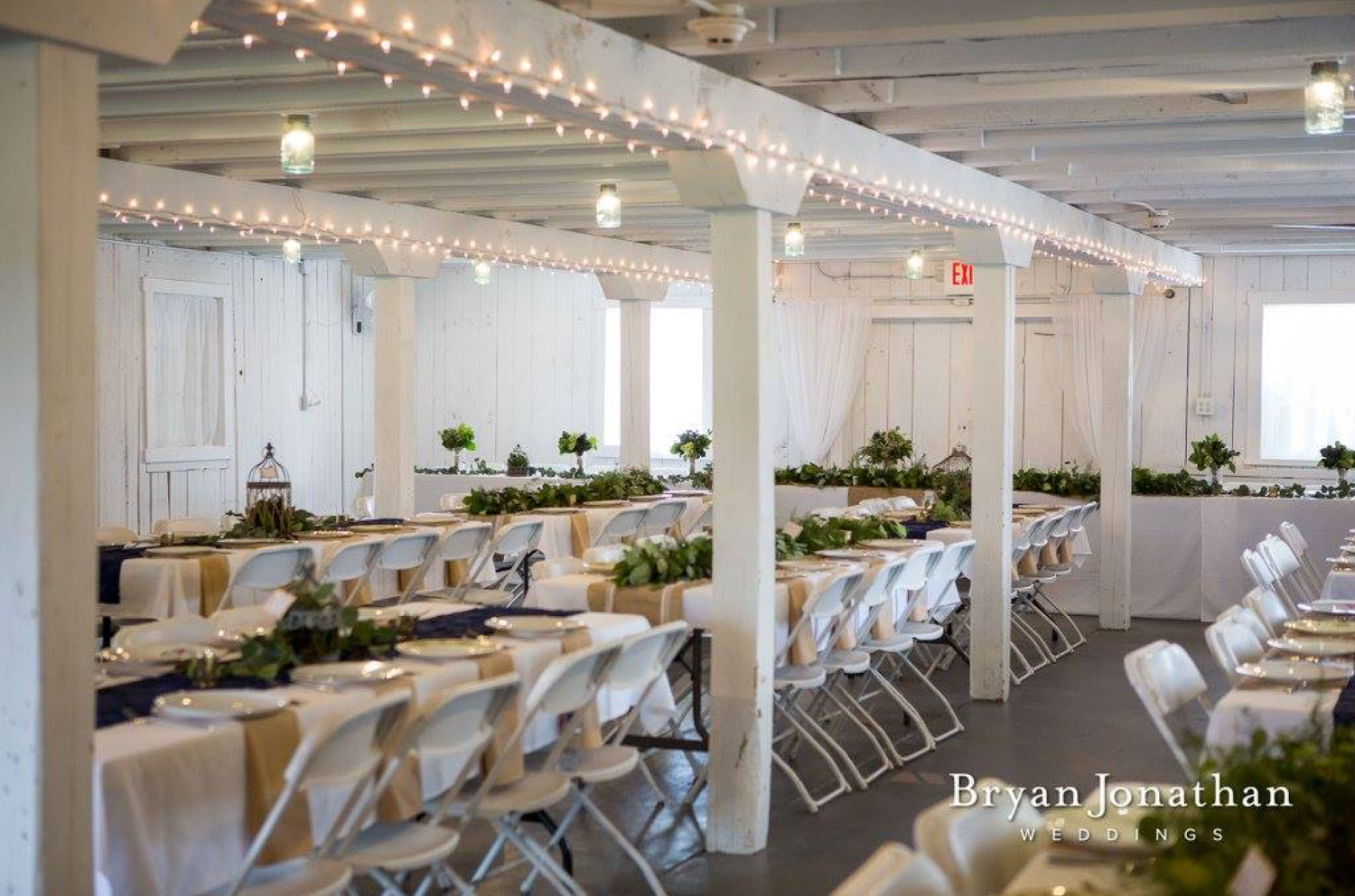 The main level of the Barn features the original rough-sawn boards painted a clean, ethereal white and beams wrapped in fairy lights. Typically an eating space, the room seats 200 guests at our wood-topped tables. The main level is surrounded by landscaping and cafe light-strung patios and the side door leads to the restrooms. The back door leads to the catering staging area, a common location for buffets.