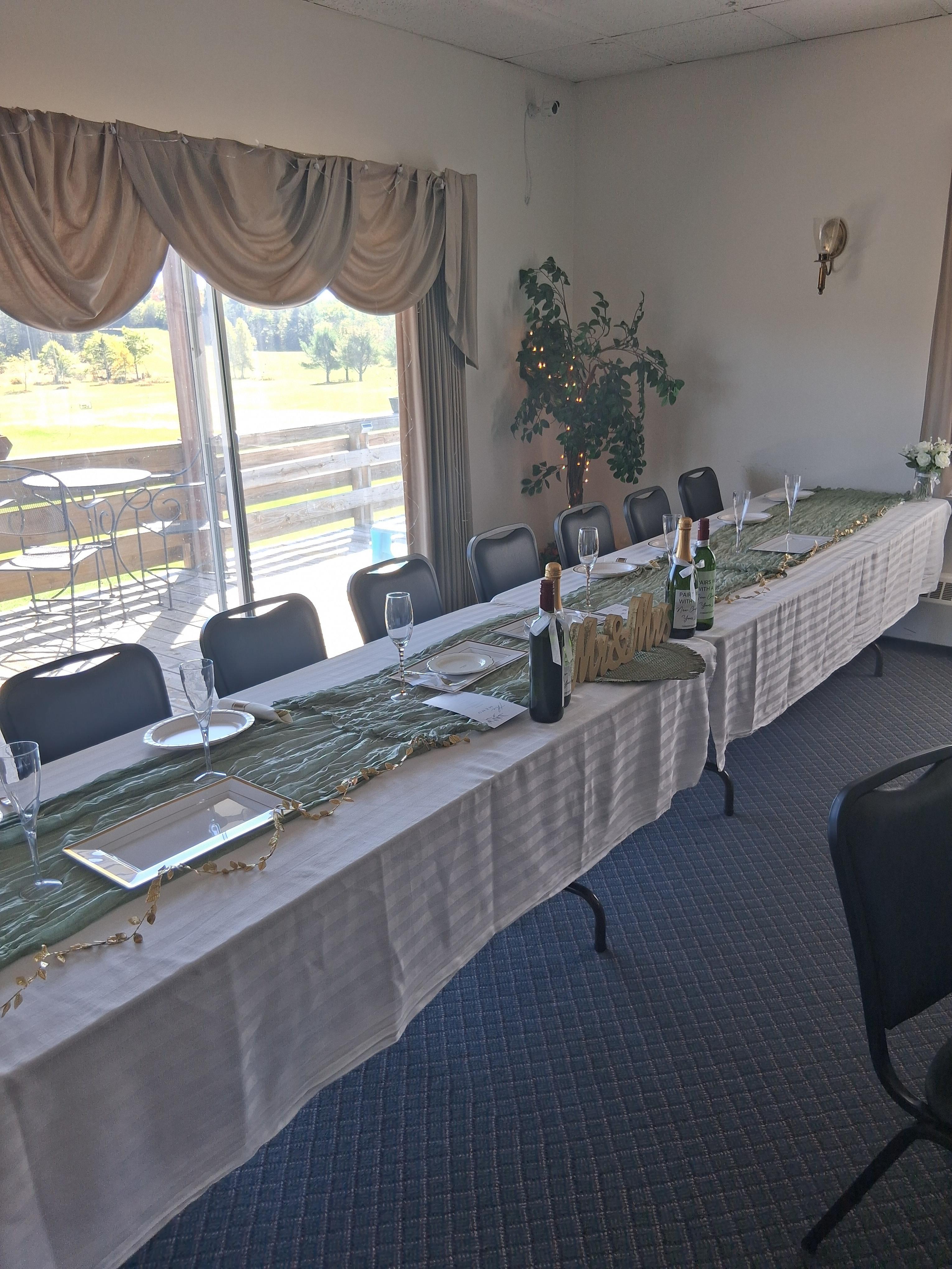 -Dimmers for total lighting customization. -Bar service - cash bar or open bar options. -Commercial kitchen stove, dishwasher, refrigerator, freezer. -Table and chair linens. -Use of outdoor gazebo and wraparound deck. -optional- use of golf cart for photos. -optional- discounts for golf play for the wedding party and guests.