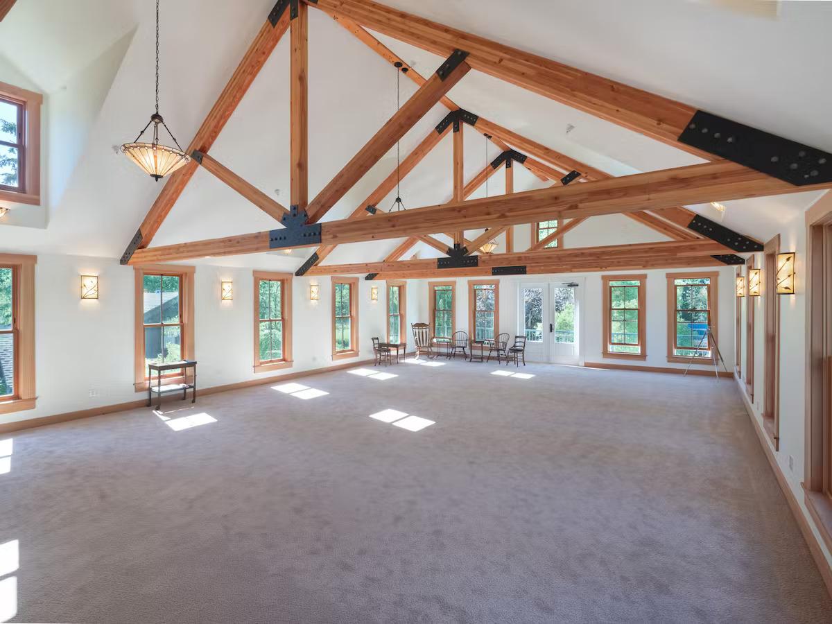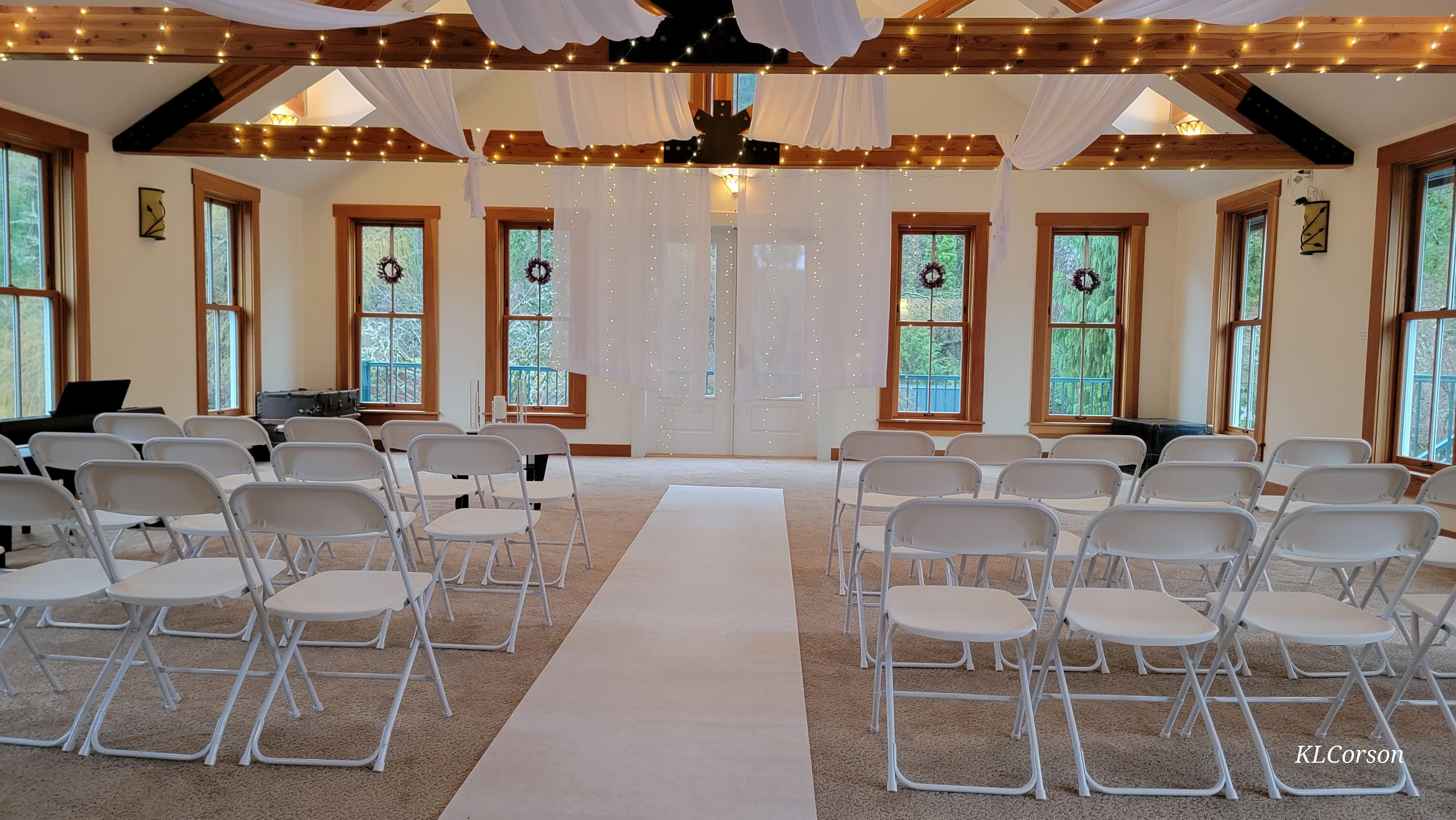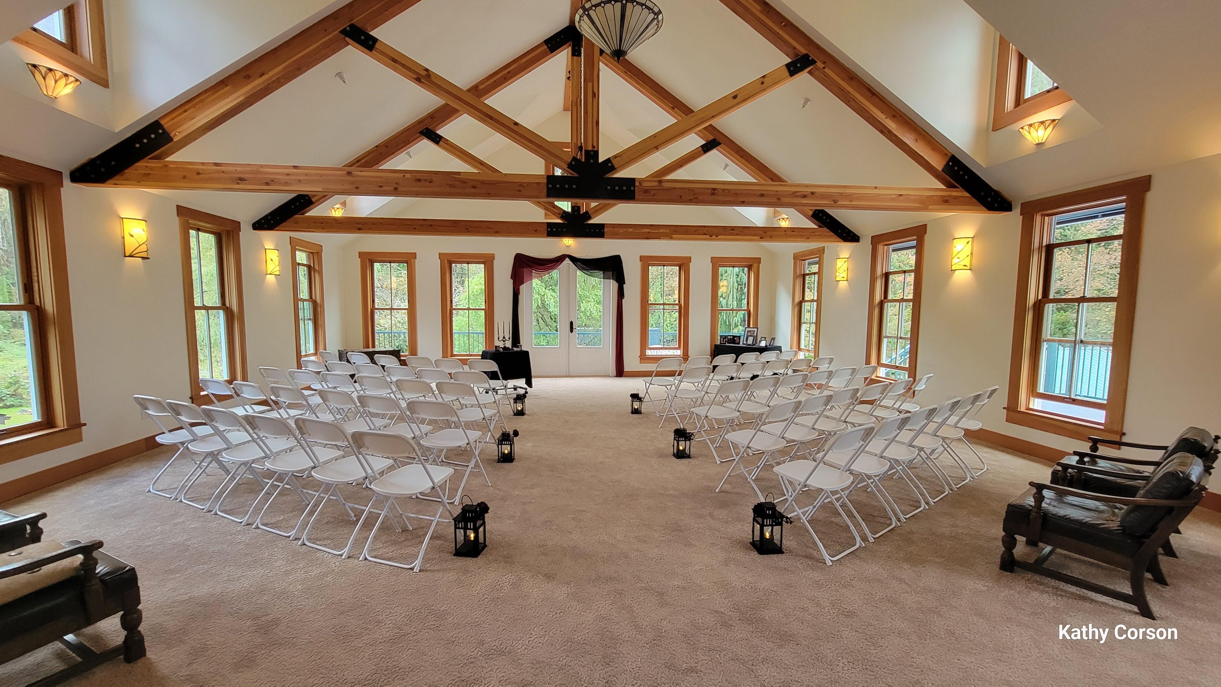 The 2nd-floor event room is a spacious carpeted room with a lofted open-beam ceiling, natural light through the many windows and dormers, a balcony with a gorgeous view of the Index Town Wall, an open deck with bistro tables, and elevator access. This bonus space can be reserved for your indoor ceremony, meet and greets, or transitional gathering area for guests during your event.