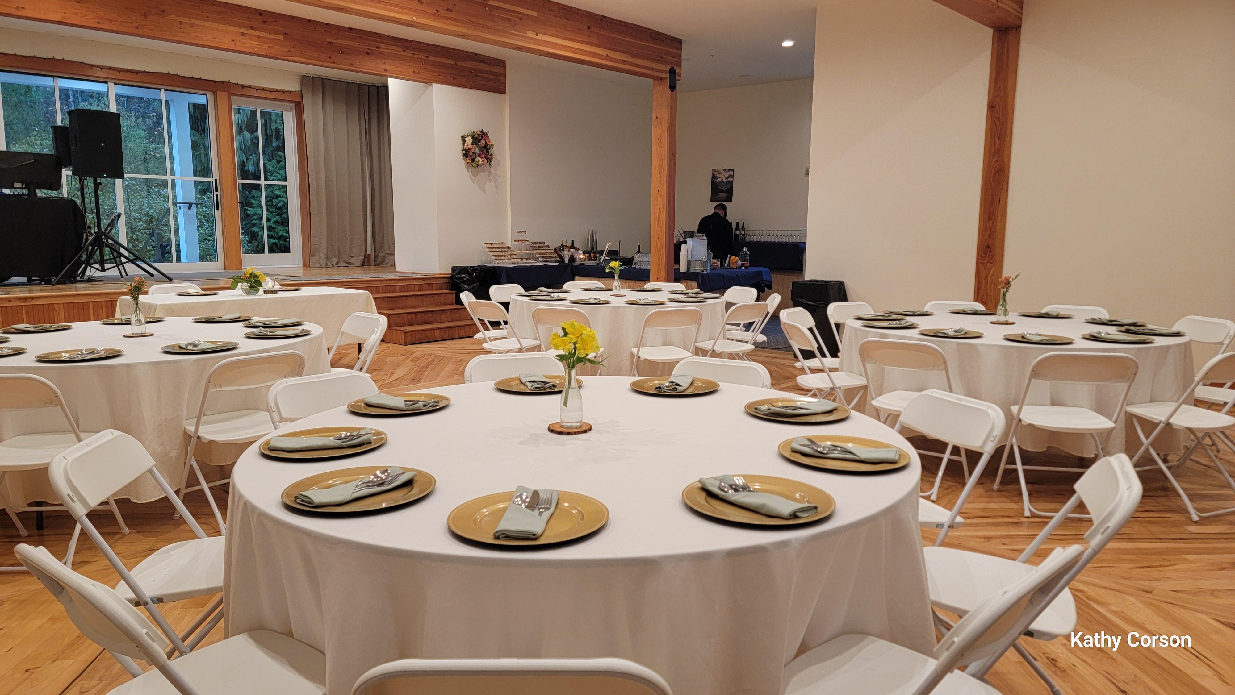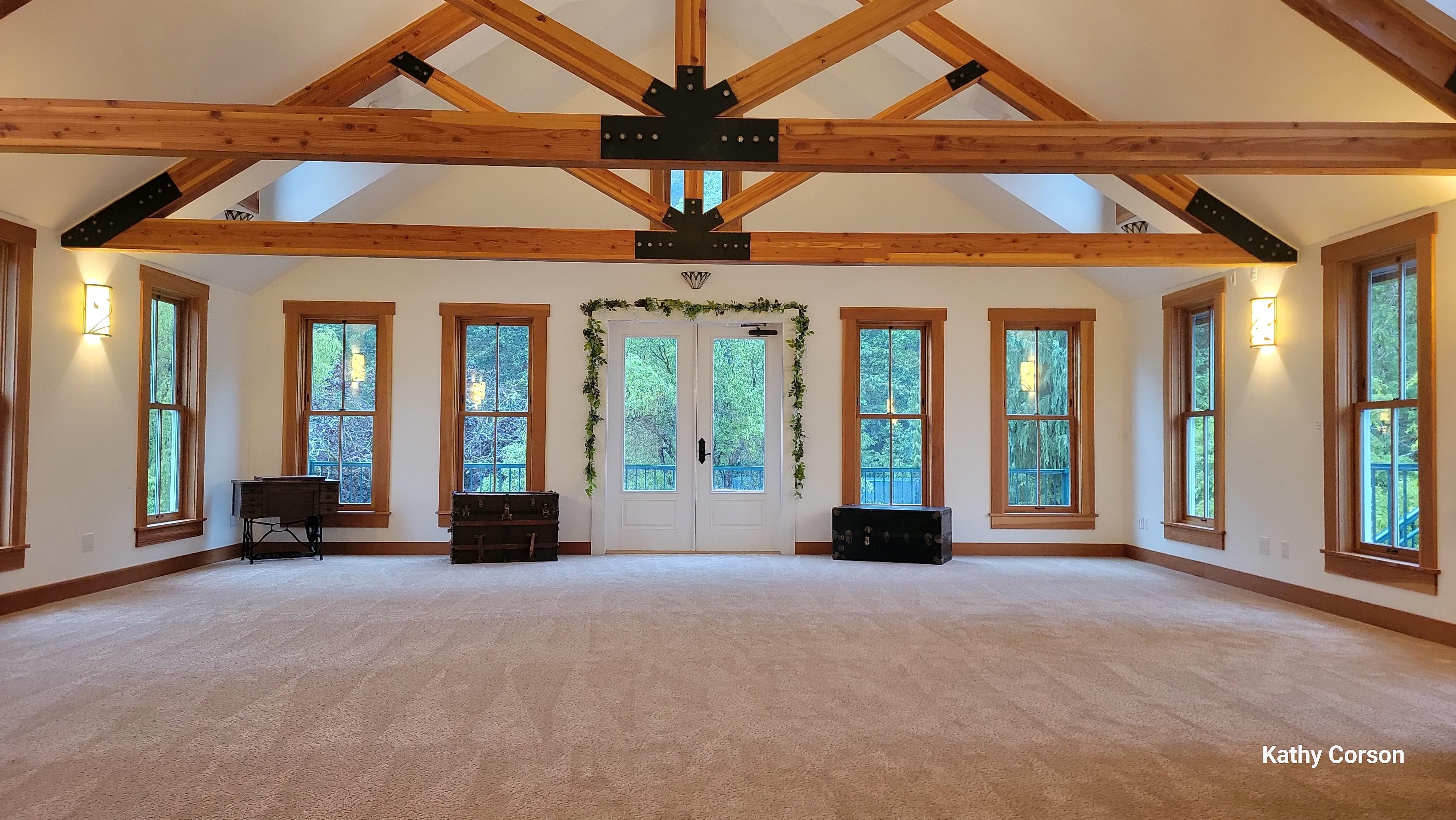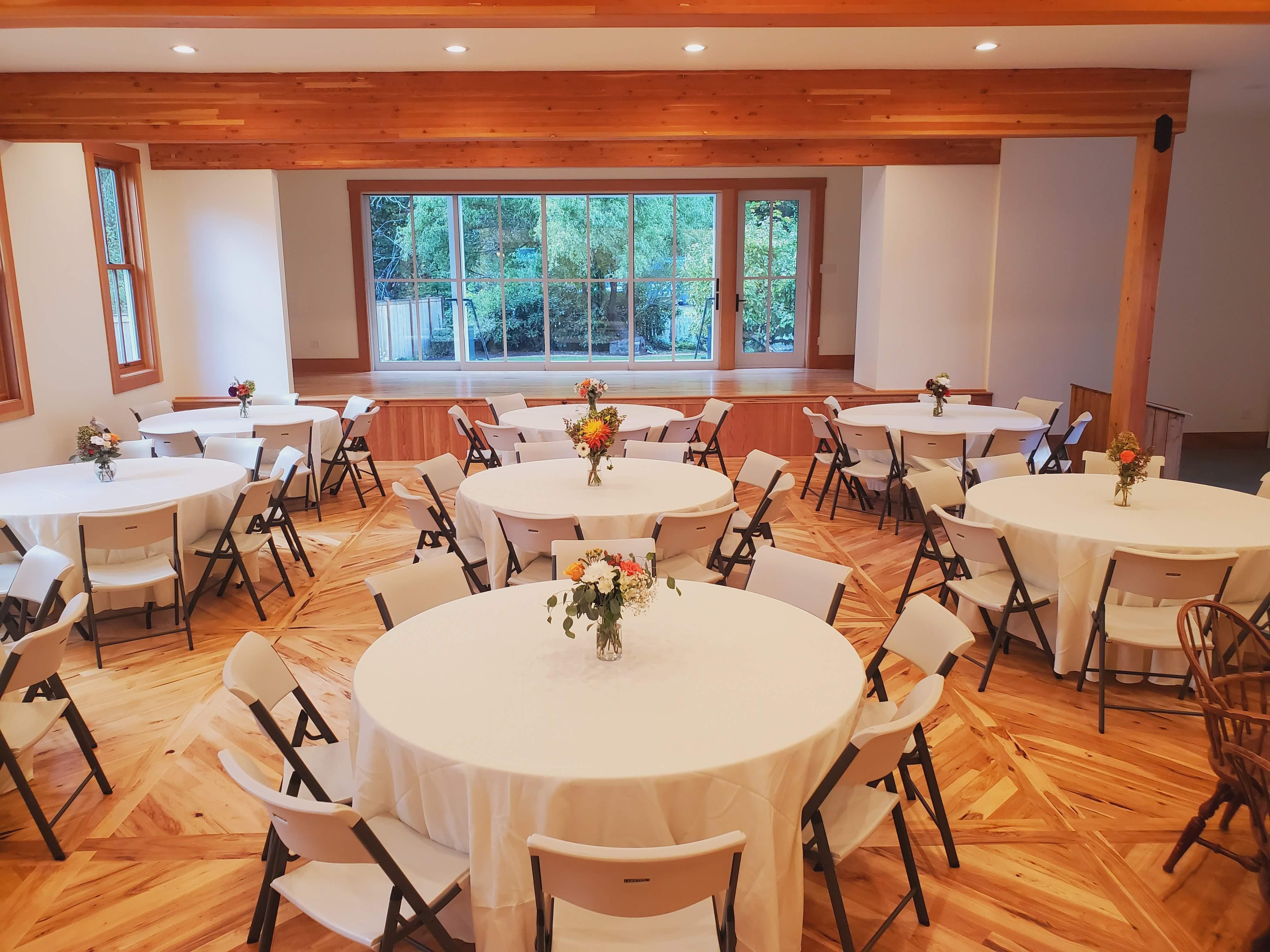 The Bush House Inn’s main floor event room features a 10’x20′ stage, projector, 150″ screen, wifi, and refreshment area. The room features hardwood hickory flooring, large windows with natural light, 11′ ceiling, a moveable wall to connect to the outside, and an elevator from the main floor.