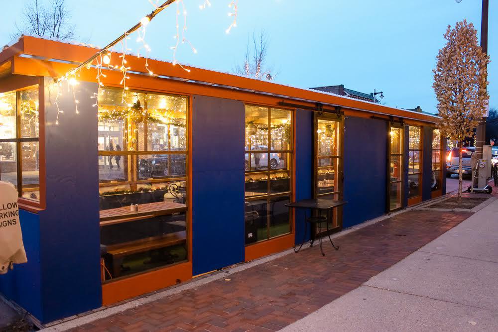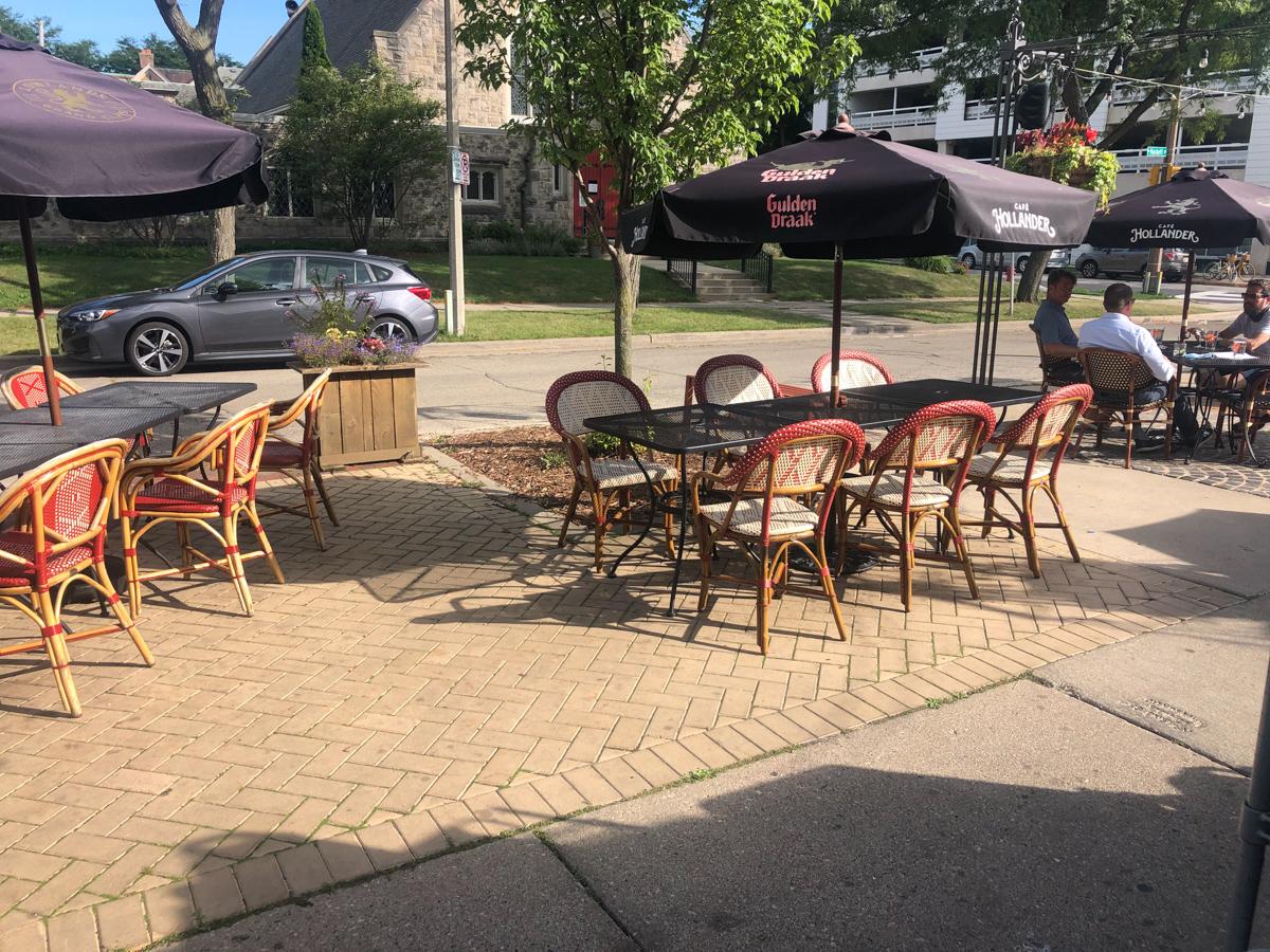 Facing bustling Downer Avenue, this semi-private patio parklet provides the perfect ambiance for those Wisconsin summer nights with overhead coverage for shade and light rain, as well as string lights and a combination of bench and chair seating.