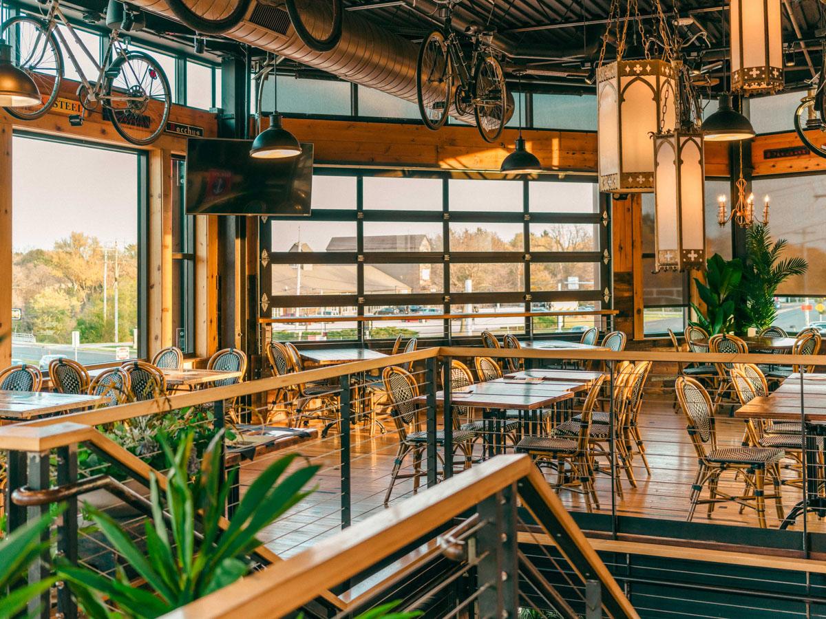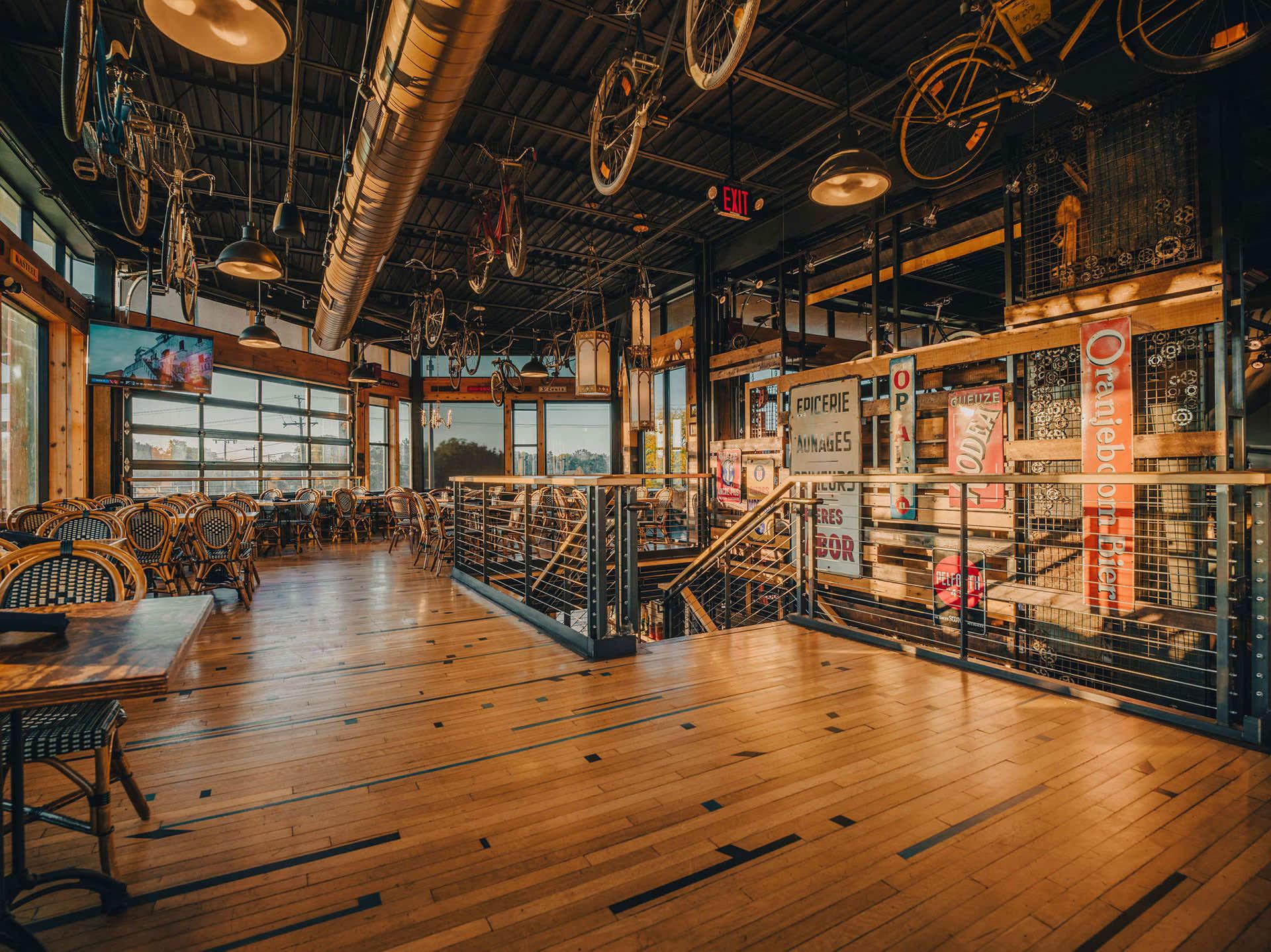 European charm welcomes you as you enter the second-floor Abbey Loft, which features stunning European lanterns and bicycles. This private indoor loft showcases beautiful woodwork and offers customizable seating arrangements, with garage doors opening to invite refreshing airflow. Complete your event with the added amenity of a private bar and TV access. Plus, accessibility is ensured with our convenient elevator access for all guests.