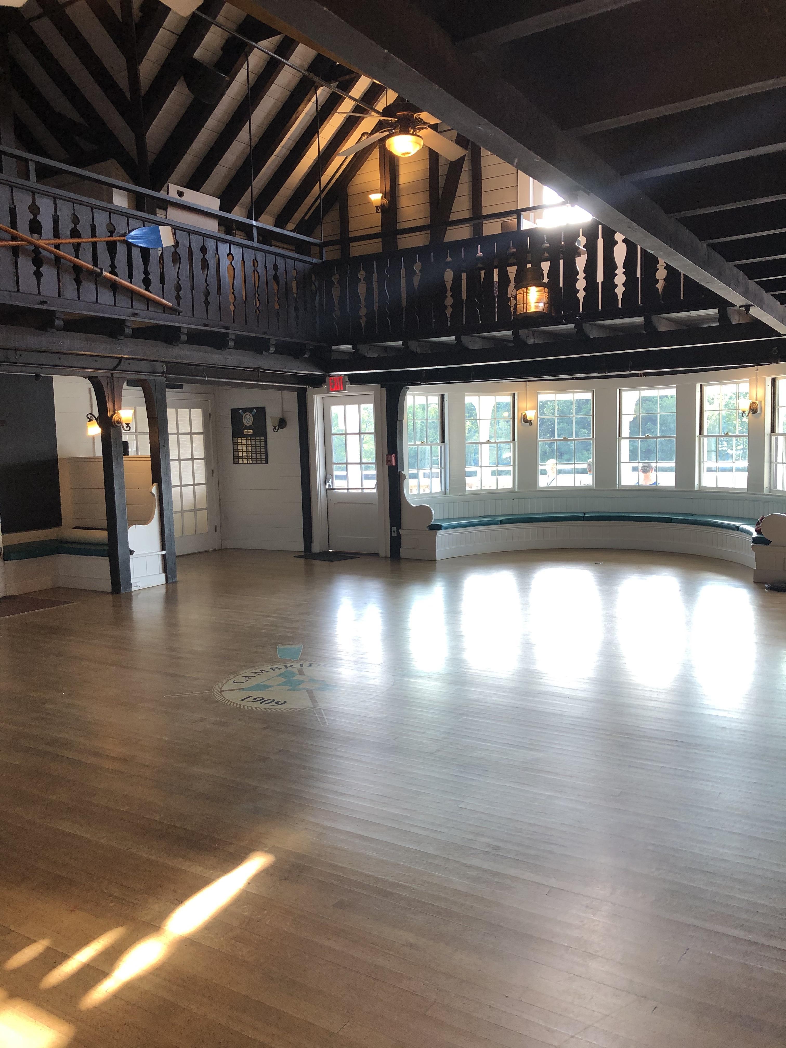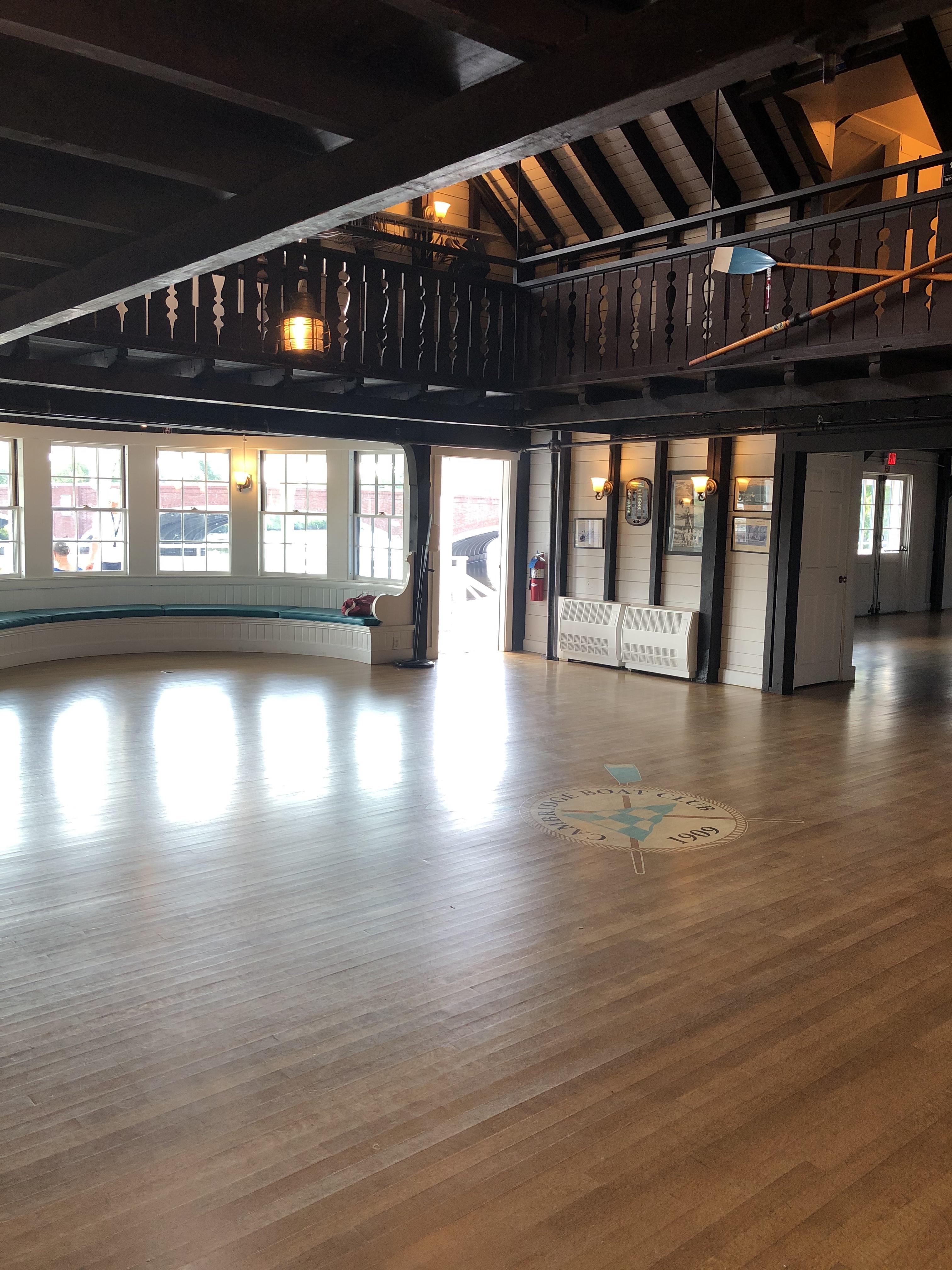 The first of two large rooms included in the rental, the Club Room features a decorative fireplace, alcove seating, vaulted ceilings, and exposed dark wood beams. A built in bar and dance floor complete the space.