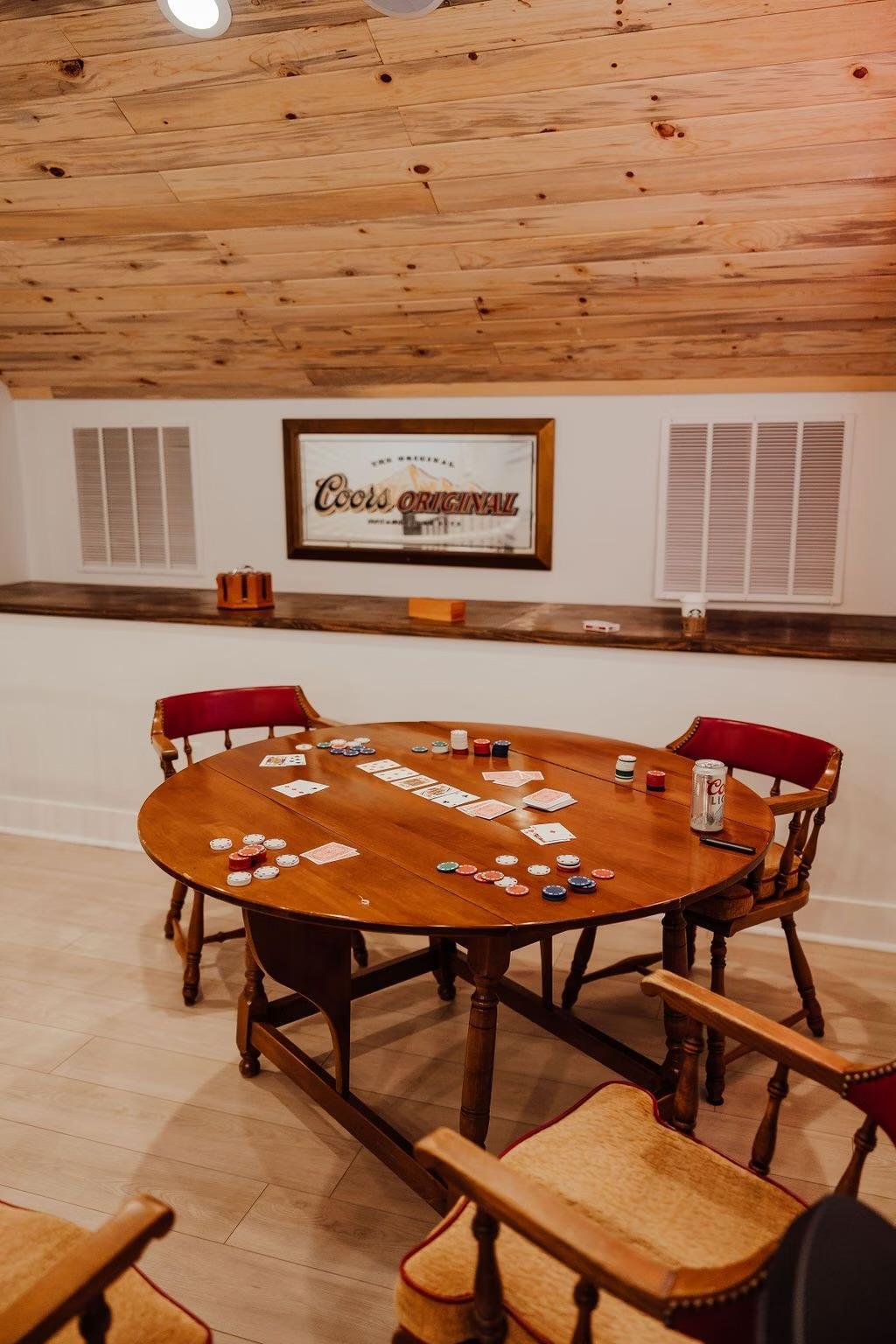 The Secondary Suite at Camp Hosea is the perfect blend of comfort and entertainment. This two-story retreat welcomes you on the first floor with lounge seating, a mini fridge, and convenient wall hooks to keep attire neatly organized. A striking spiral staircase leads to the second floor, which features a poker table, ping pong table, and TV for you and your party to enjoy. You’ll also discover a stunning overhead view of the Chapel, creating a truly unique perspective of your venue.