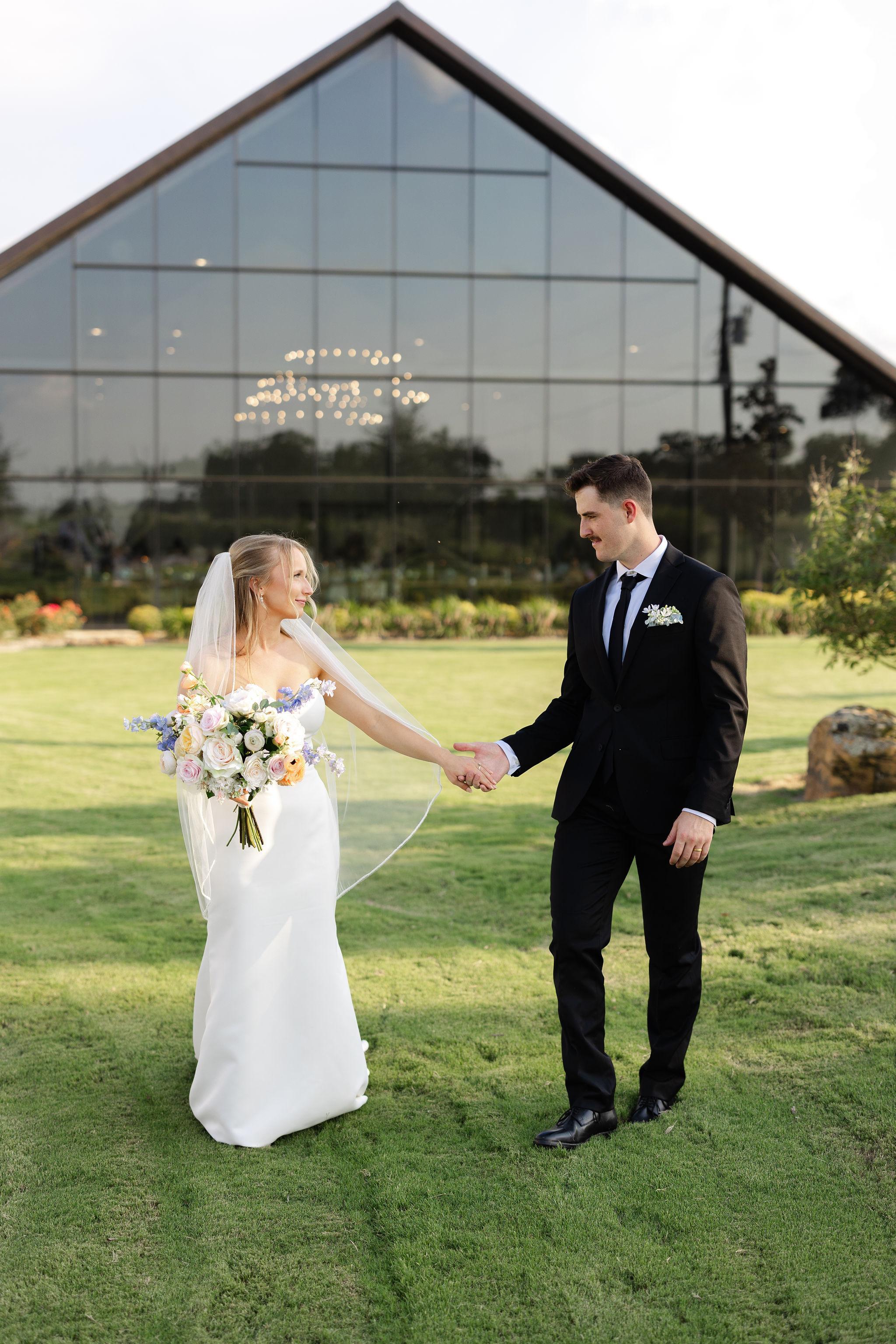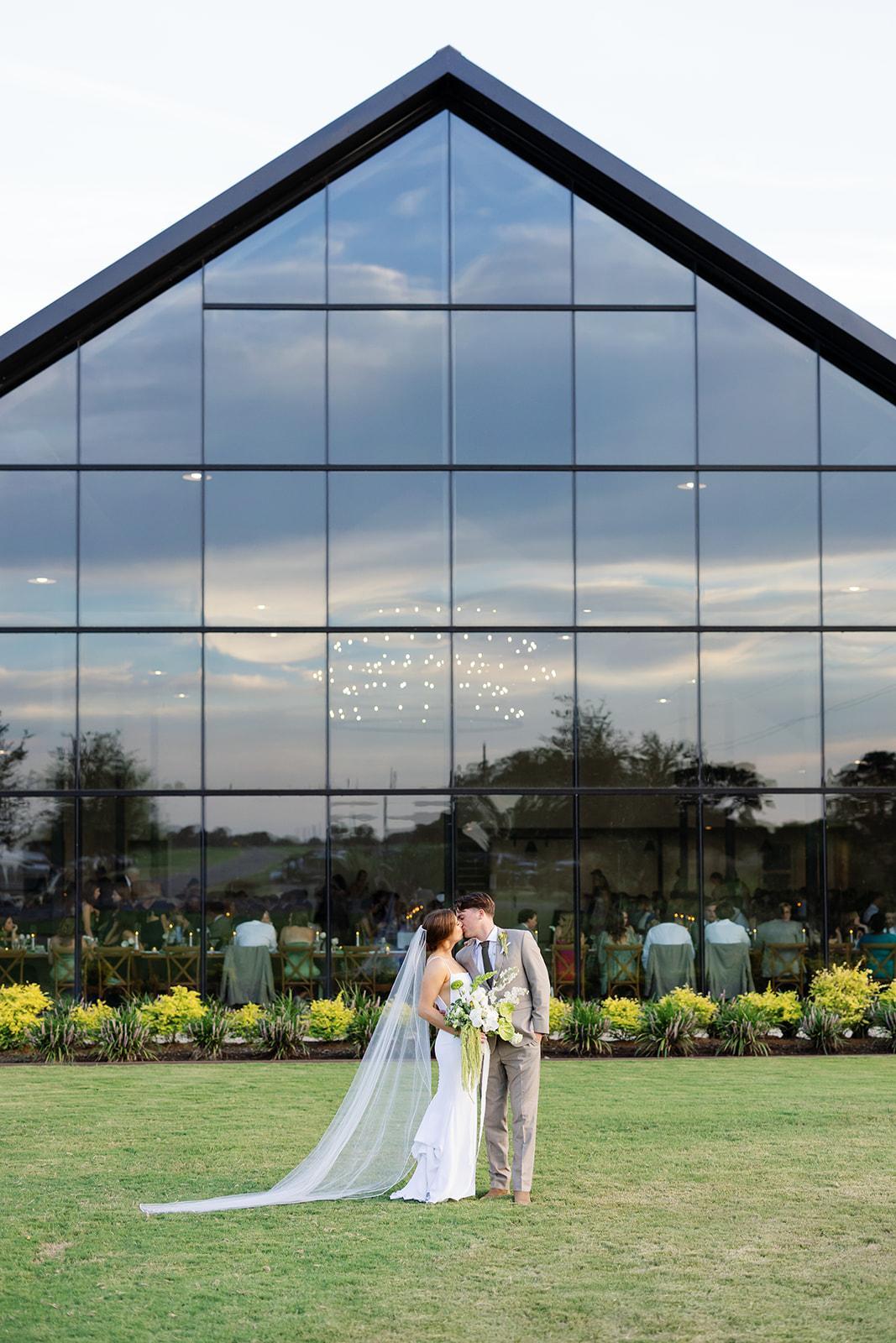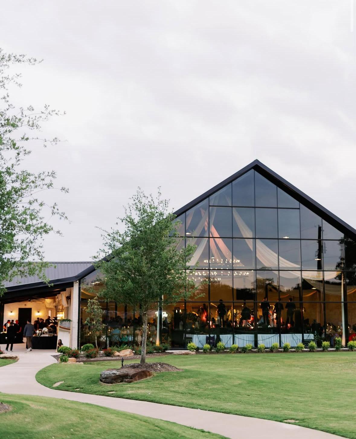 Inside the reception hall, even more spectacular vistas unfold. Boasting brick walls and iron chandeliers, every facet of this space is designed to bring the outdoors in — especially the dramatic glass wall that stretches from floor to ceiling. As dusk fades into night, and the warm glow of candlelight dances on the glass, you’ll experience the perfect finale to your big day.