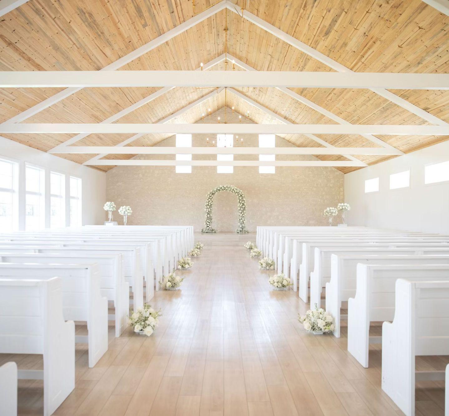 The bell-tower chapel, which stuns with its grand wrought-iron doors and farmhouse-style facade, is a stunning setting for your wedding ceremony. Inside, a restrained natural palette allows the natural views to sing — think: light wood floors, white wooden beams, and a neutral brick wall that offers a timeless backdrop to your “I dos.”