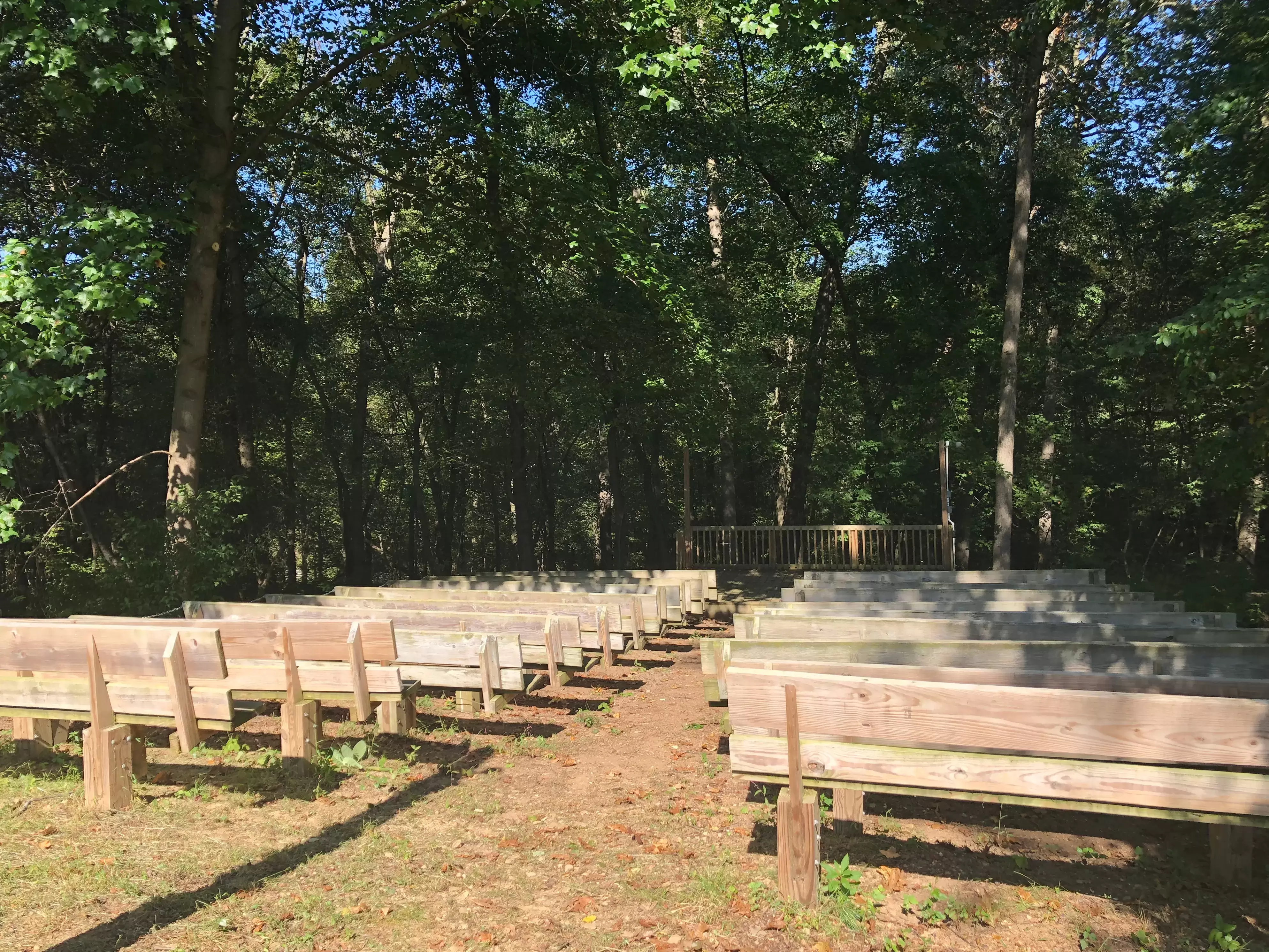 Our 120-140 seat amphitheater in the woods is a favorite place for guests to gather for activities such as family talent shows, movie nights, and church services. The amphitheater is beautifully set under a canopy of trees in the woods just 40 yards north of our two overnight facilities, the Lodge and Willow. The amphitheater benches are lit by a pole light at the rear where there are also multiple electrical outlets. The amphitheater also has wireless high-speed Internet access for use with the video projector also provided by the camp.