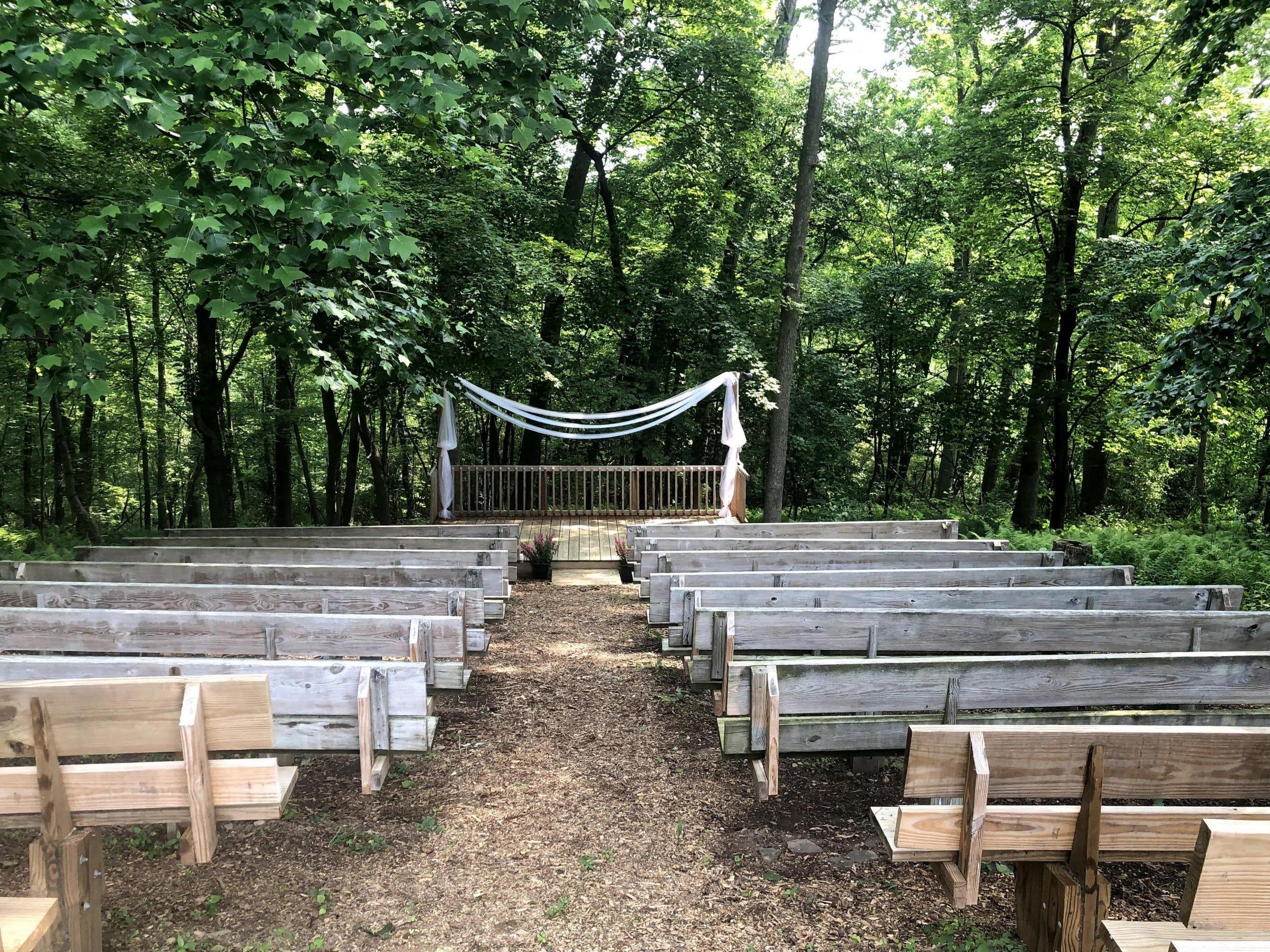 Camp Oak Hill offers its guests exclusive use of the entire Camp Oak Hill property and all indoor and outdoor rental facilities. Couples that book Camp Oak Hill for at least two nights may hold Wedding ceremonies and receptions as part of their camping experience. Wedding ceremonies may be held anywhere on Camp Oak Hill property, but couples typically take advantage of the Williamson Amphitheater in the woods. The 120-140 seat amphitheater is beautifully set under a canopy of trees.