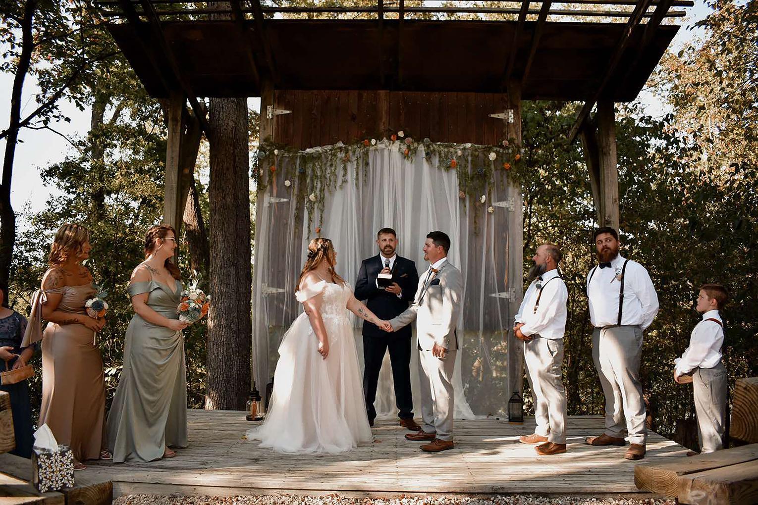 Originally envisioned as a Girl Scout Camp in the 1930s and set on its own peninsula within Lake of the Ozarks State Park, Camp Pin Oak has been the backdrop for decades of lake fun—from making friendship bracelets to saying "I do." We provide the perfect setting, and you handle the rest! It’s truly that simple. With an industrial-grade kitchen, a stunning waterfront amphitheater, a charming rustic lodge, and accommodations for the bridal party, our venue gives you the best of both worlds: a picturesque location and the freedom to choose your own catering, DJ, ceremony style, and more!