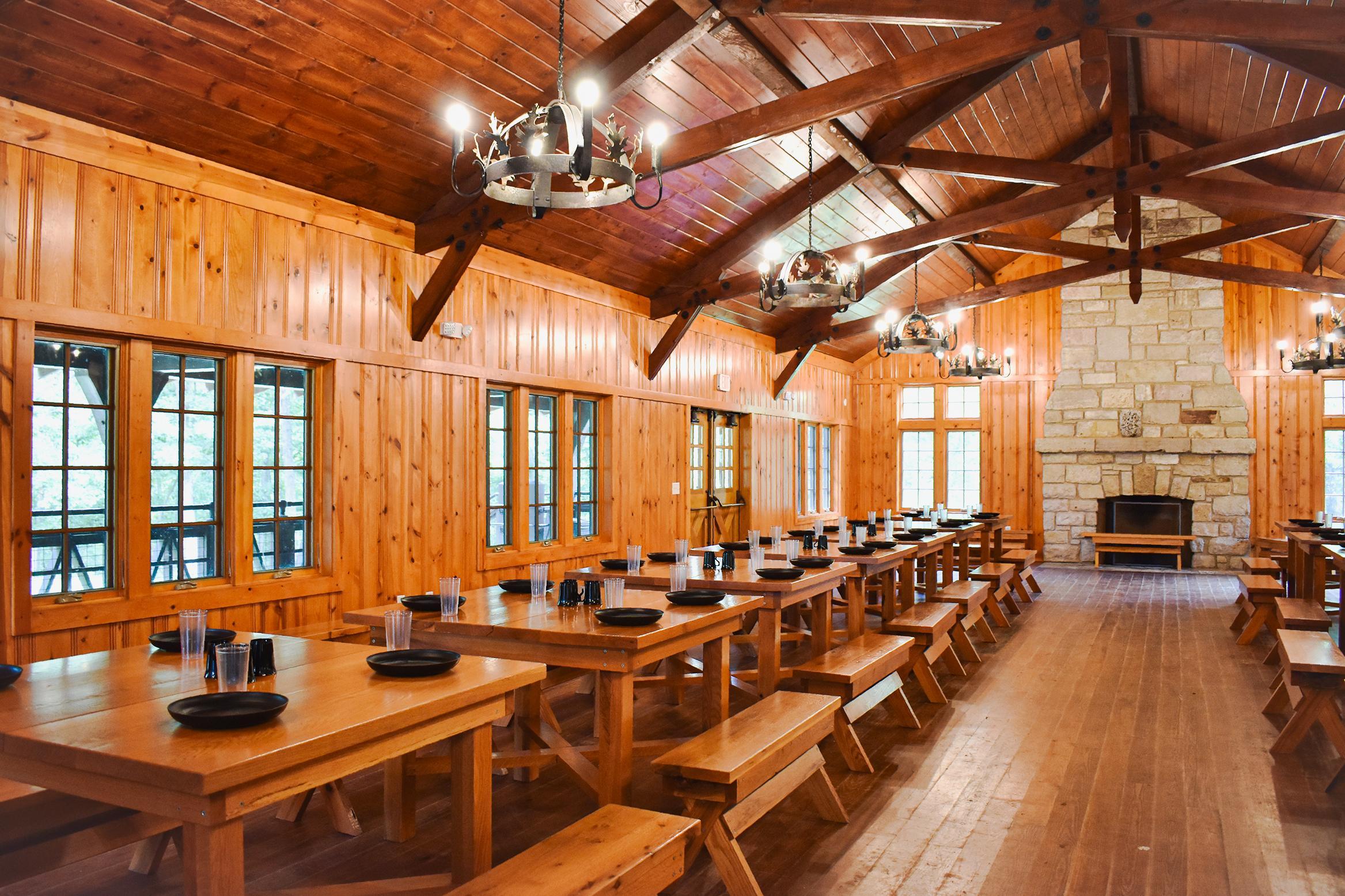 Built in the 1930s by the Civilian Conservation Corps (CCC), and meticulously rebuilt in 2013 after a devastating fire, our lodge exemplifies craftsmanship at its finest. On each end, you will find a grand stone fireplace, each wall, stunning timber, and above you, hand-crafted light fixtures. In the back, we have an industrial-grade kitchen with everything you need to prepare a delicious meal. Outside, you'll find a large patio with umbrella seating!