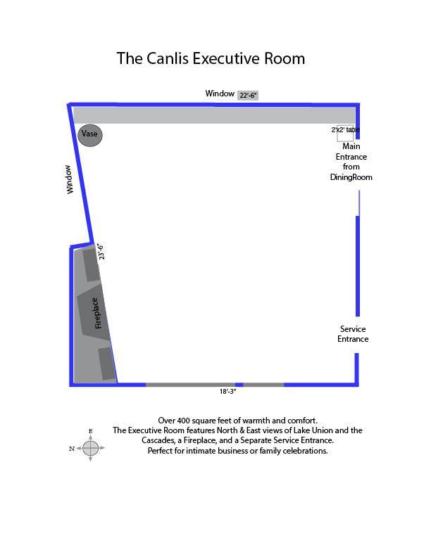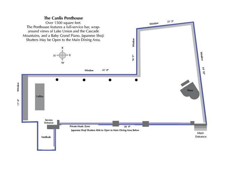 Originally built as our grandfather’s residence, the Penthouse sits above our dining room and is approximately 1500 square feet. It features a full service bar, dining room views, wrap-around views of Lake Union and the Cascade Mountains, and a baby grand piano.