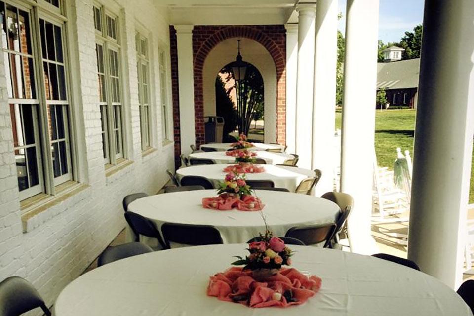 Our rehearsal dinner and reception venue, Berry Hall, is adjacent to the chapel and features a bluestone courtyard on one side of the building and a covered porch overlooking manicured lawns on the other side. Guests can dance the night away or mingle under the stars. The flexible space lends itself to a variety of designs and wedding themes. It holds up to 300 guests, and past events have extended the space with tents.