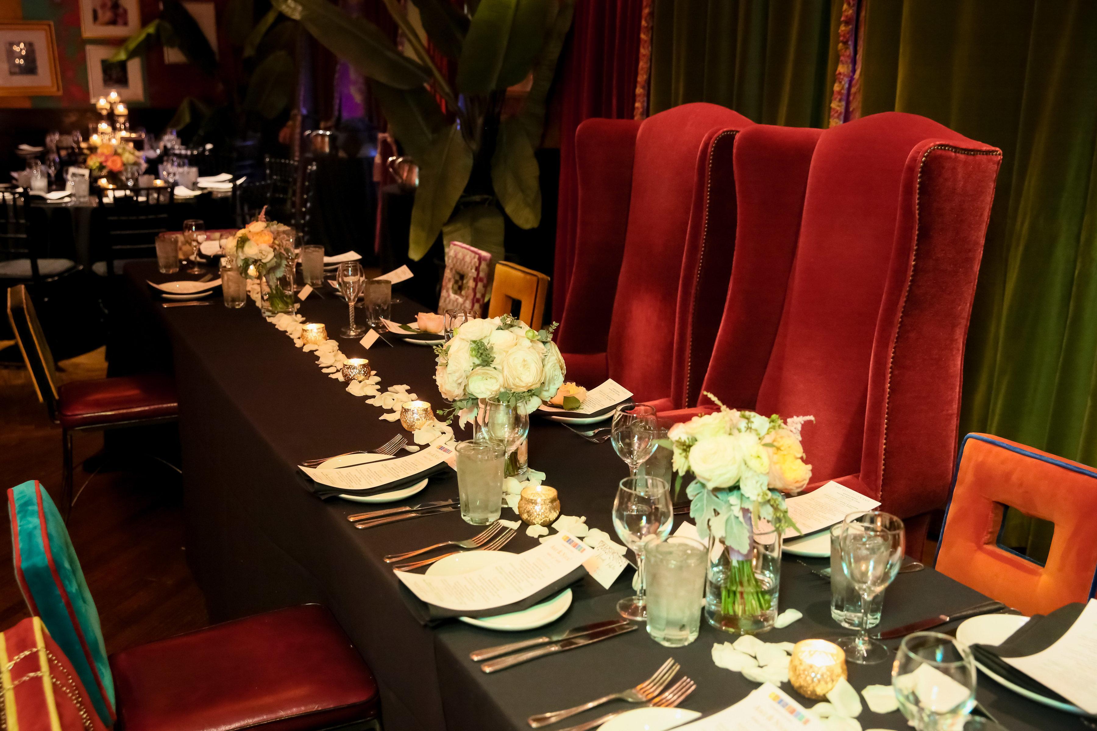 • 3 Course Dinner (Plated Salad, Family Style Entrees, Shared Sides, Mini Sweets) • 5 Hour Premium Bar Package with Tableside Wine Service • 5 Hour Premium Bar Package with Champagne Toast, Table side Wine Service All Packages Include: Black Chiavari Chairs with Vibrant Colored Seat Cushions Red or Pink Velvet King and Queen Chairs for couple Choice of Black or White linens Votive Candle Centerpiece Custom Printed Menus Bar upgrades available Private Bar with 2 Bartenders
