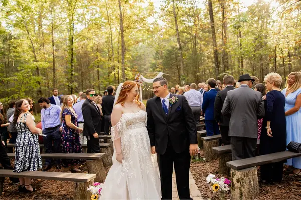 My dream ceremony spot was in the trees, and this venue was the only one I found in the area that offered it. The Enchanted Forest microwedding option was ideal; the venue is rural, peaceful, and spacious. They had an excellent unbeatable selection of decor and allowed any professional caterer. Communication was great, and I never waited long for answers. Closer to the event, having Holly, my coordinator's personal number for texting, was helpful. She and her assistant were excellent in setting up and stayed on top of the timeline. The phone and video calls, in-person decor selection, and venue walkthroughs eased my worries. While other bridal areas weren't pretty and/or small (locker room, gym, large closet) the bridal suite was large and beautiful, and the free engagement shoot perk was nice. Meeting Melanie, her husband and their dogs shows this is a family business. Fantastic venue.