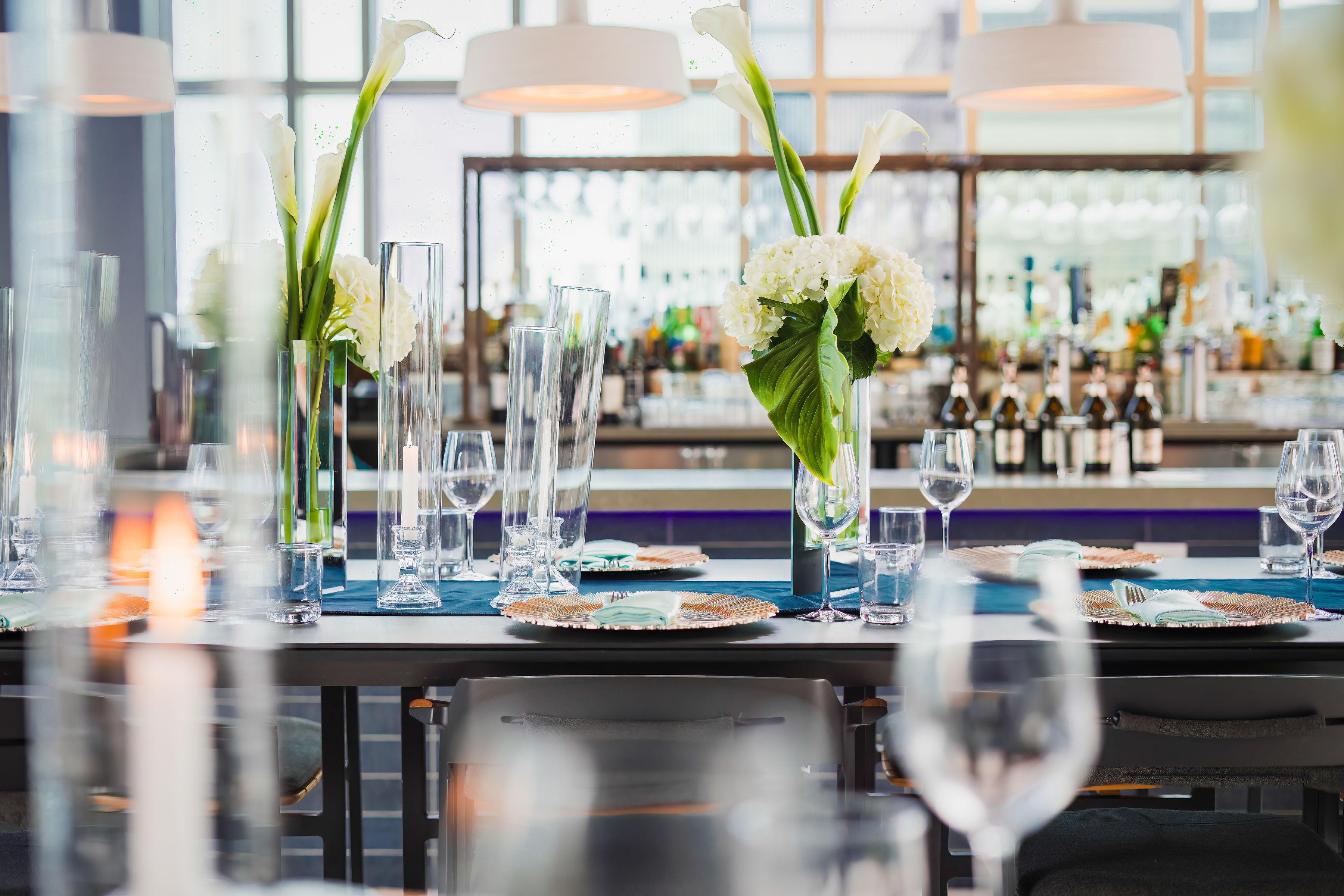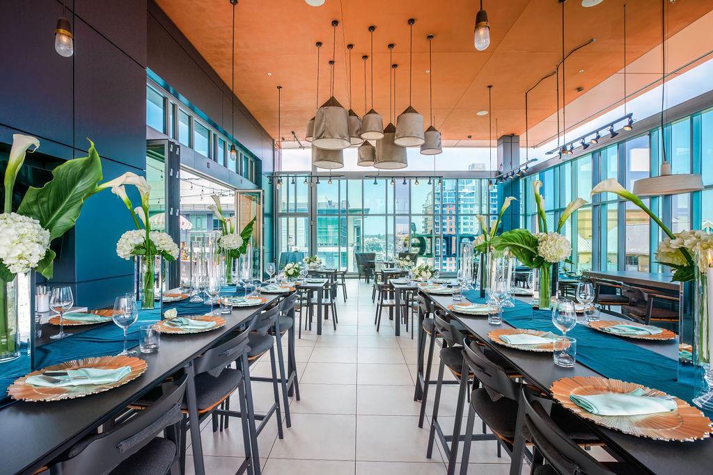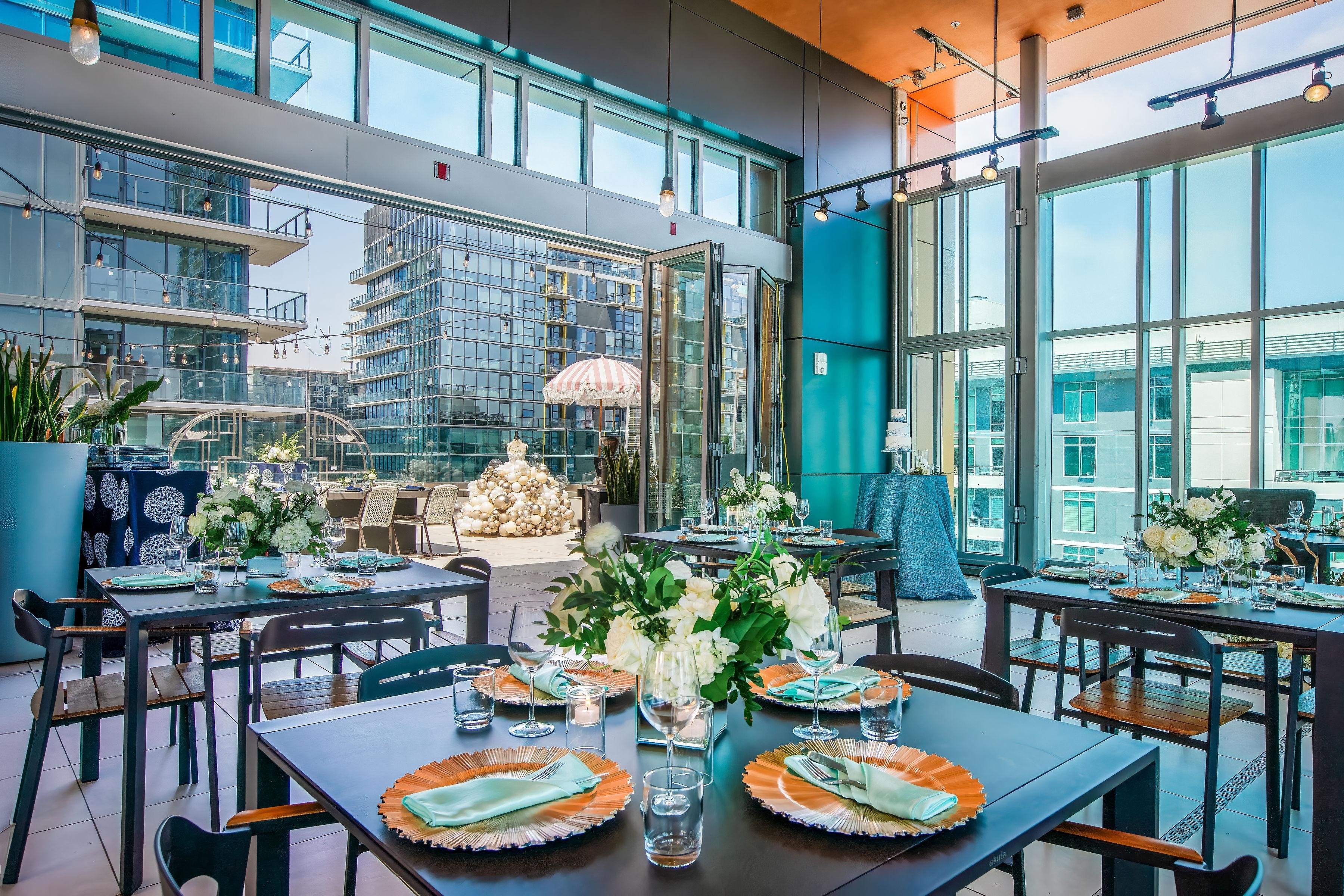 This space features 1,300 square feet of indoor space event space. Floor to ceiling windows create natural light and a vibrant energy. Modern chandeliers and dimmer switches. Great for a cocktail receptions, rehearsal dinners and welcome receptions!