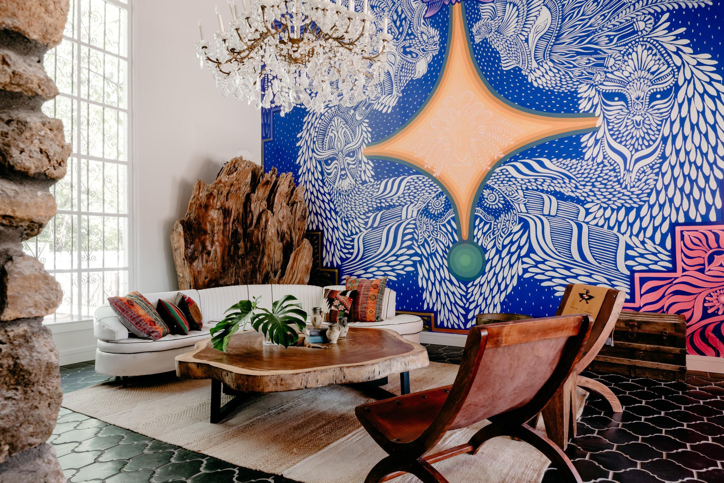 Casa Cartel stands out as a one-of-a-kind venue perfect for hosting micro weddings. This historic villa, rich with cultural heritage and artistic flair, provides an enchanting backdrop for intimate celebrations with a capacity of no more than 50 guests. Casa Cartel is renowned for its colorful murals, Mexican-inspired furnishings, and a captivating blend of Aztec and Mayan influences. The living room, adorned with a 20-foot high mural is a focal point of the house, exuding a mystical ambiance. The courtyard, complete with a fountain-like swimming pool, offers a picturesque setting for wedding ceremonies and receptions. The venue and its two living room spaces provide ample space for gatherings. The dining room, featuring a large table crafted from a single slab of wood, can seat up to 18 guests, making it ideal for intimate dinners. The courtyard pool area is perfect for ceremonies and cocktail hours. The venue's layout allows for flexible setups to suit various wedding styles.