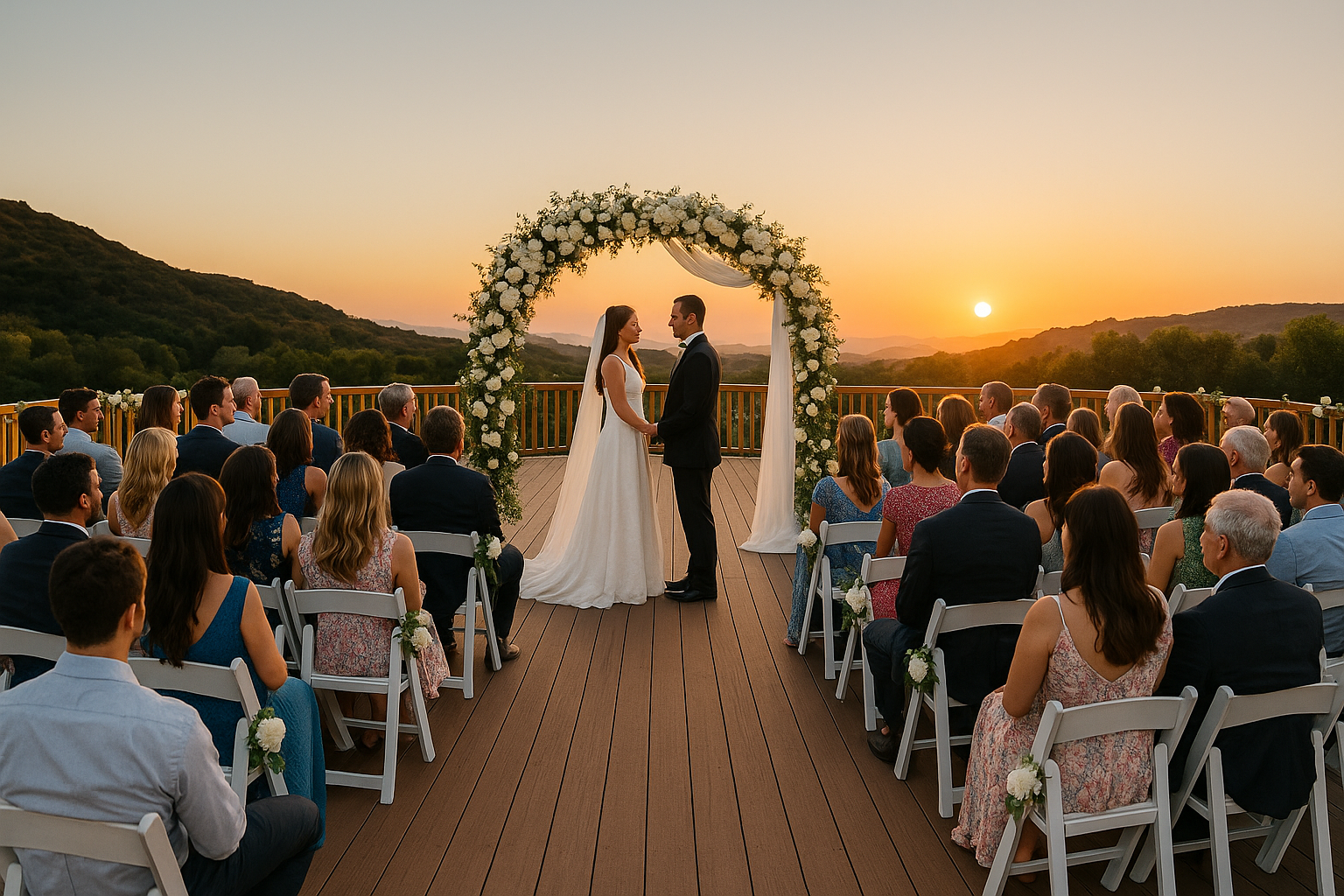 Panorama Paradiso Villa by Casa De Luz is a Mediterranean-inspired wedding and retreat venue set in the rolling hills of De Luz, Temecula. Designed for intimate celebrations and meaningful connection, this serene estate offers panoramic views, timeless architecture, and a soulful natural setting. Thoughtfully curated and deeply personal, it is a place where gatherings become lasting memories. Guests arrive through an orchard of mature persimmon trees — planted more than two decades ago by the original owner for his wife, whose love of the fruit inspired their quiet devotion. That story lives on in the land and atmosphere of this estate. At the heart of the property is an expansive 800-square-foot deck with sweeping views of the hills — an ideal setting for golden hour ceremonies, open-air receptions, and reflective mornings.