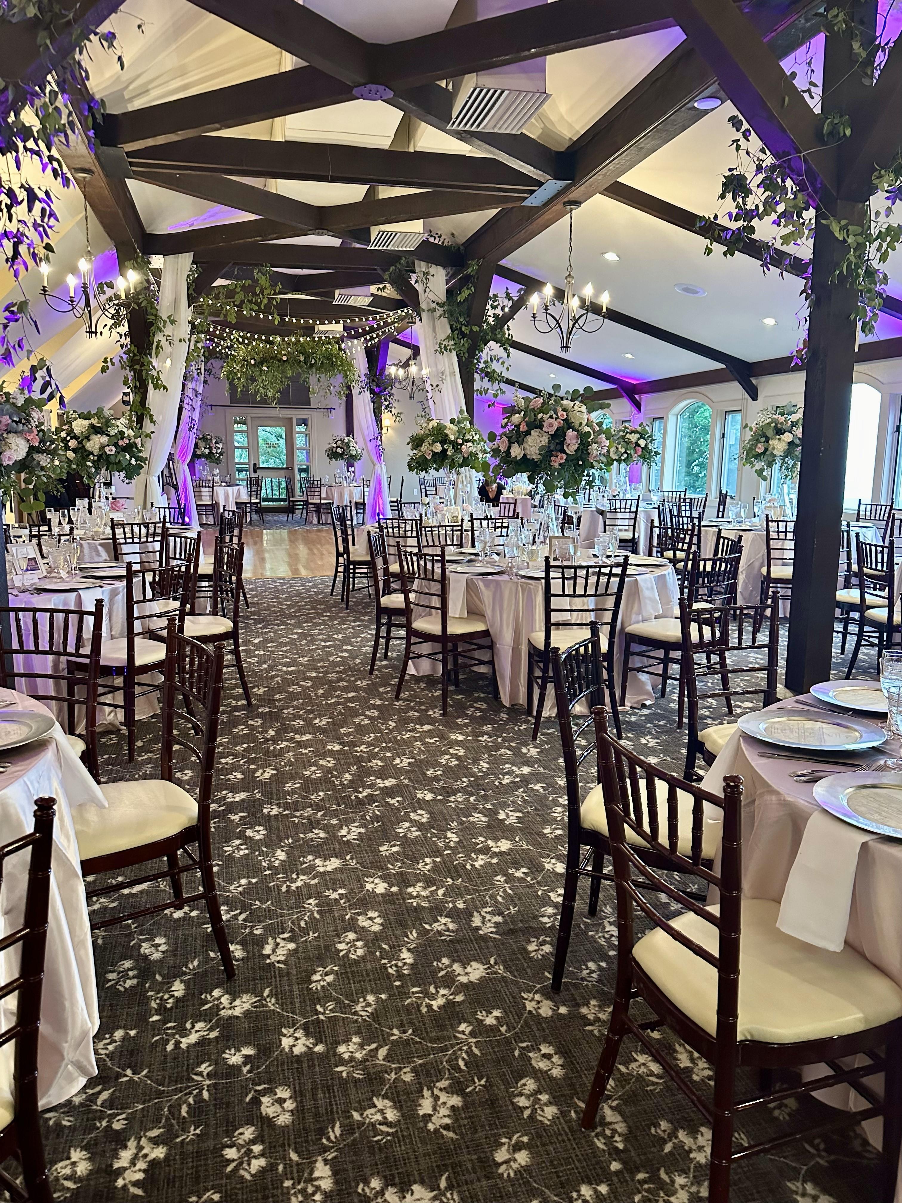 Host your reception in a rustic country chic room adorned with exposed beams and breathtaking views through arched windows.