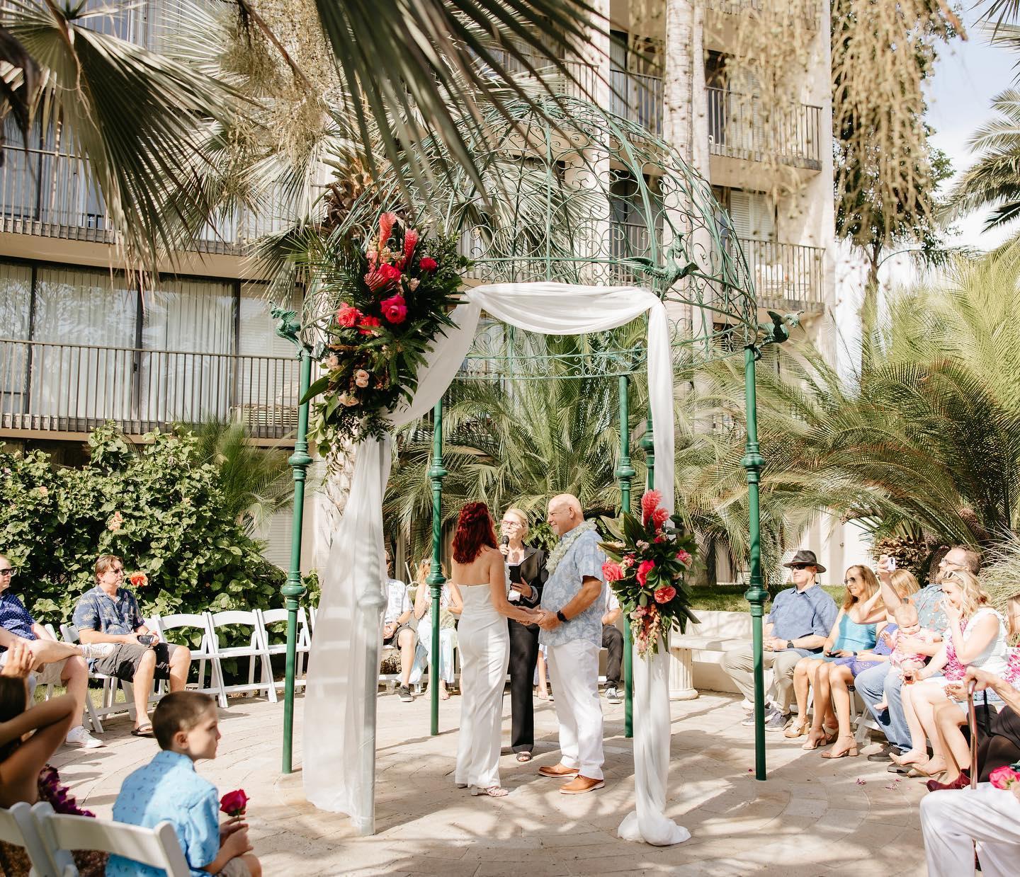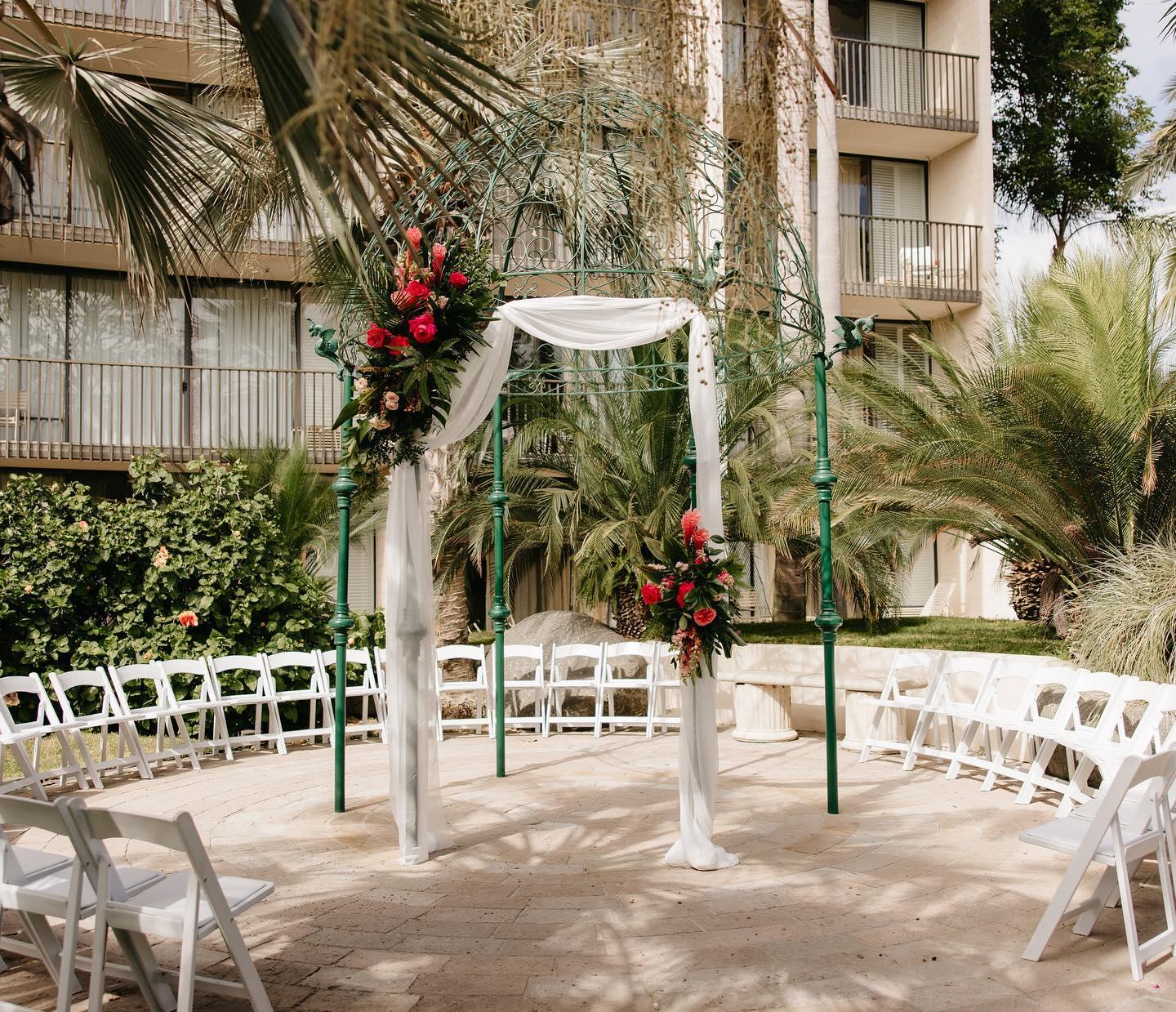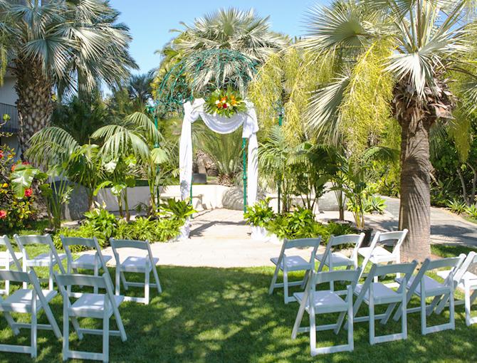 Hidden among exotic palm trees, lush gardens, and reflective koi ponds, the Catamaran's private garden gazebo offers a peaceful and tropical setting for your wedding ceremony of up to 70 guests.