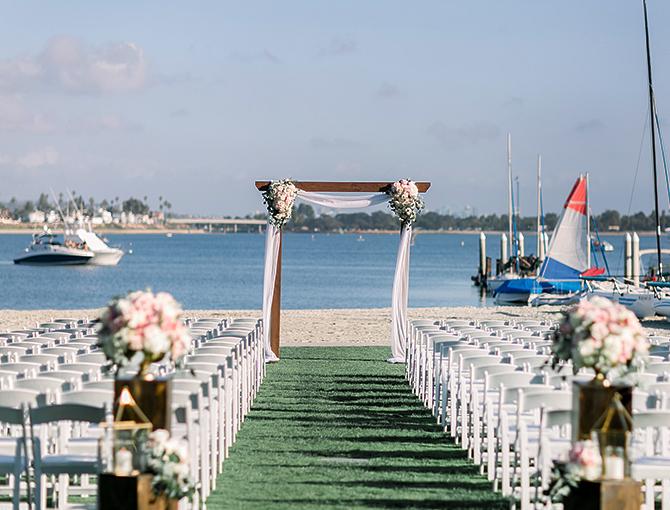 Set between two pairs of towering palm trees and featuring panoramic views of sparkling Mission Bay, this iconic location is the Catamaran’s largest beach wedding venue ceremony site, holding up to 350 guests.