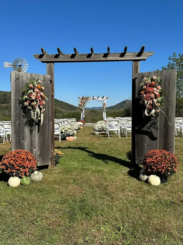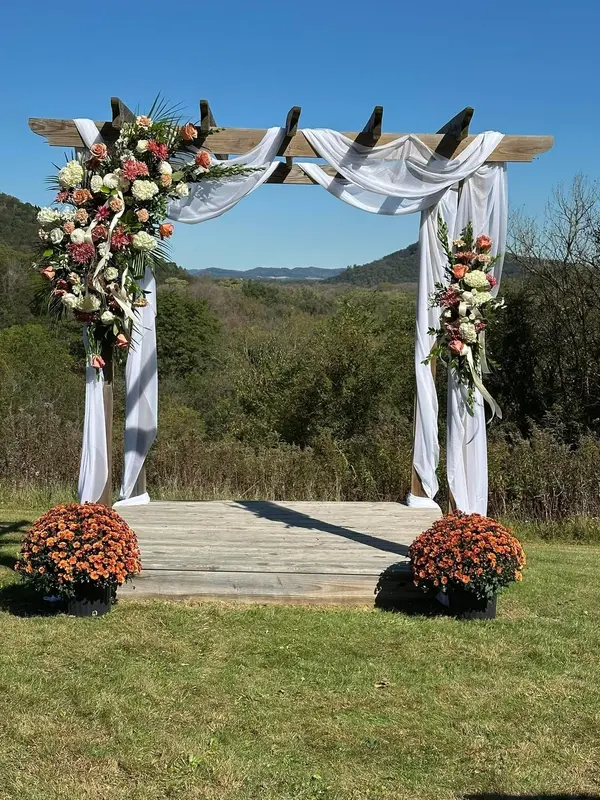 This Ceremony Space sits atop a hill overlooking the Mississippi River Valley. Permanent wooden pergola and entry doors give it a warm rustic feel. Renters can decorate however they please.
