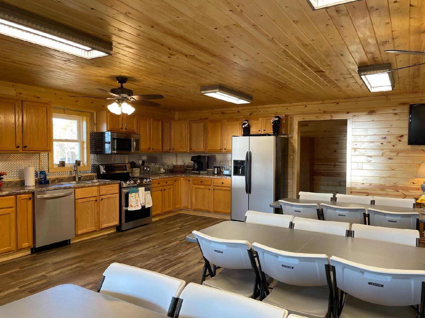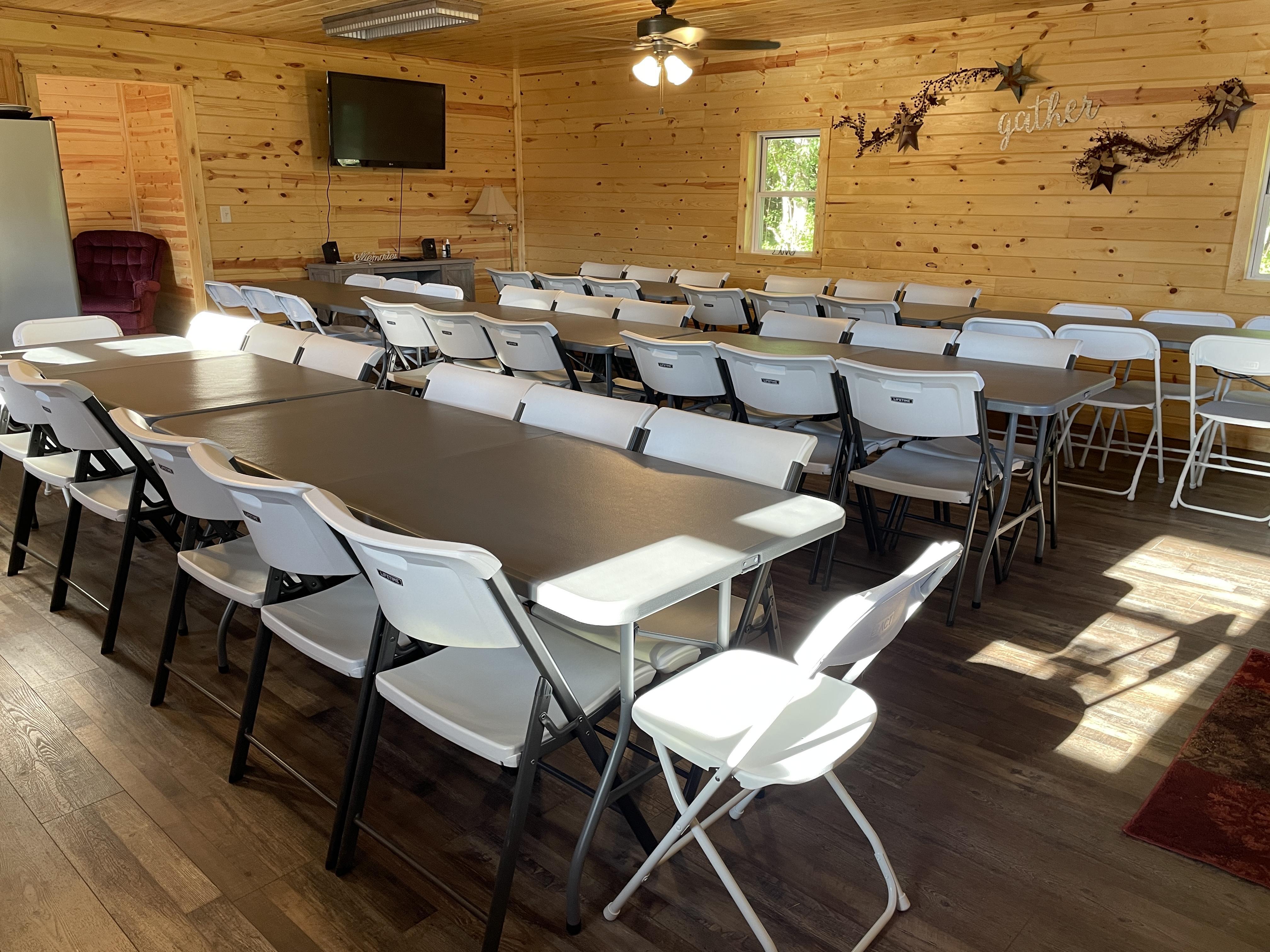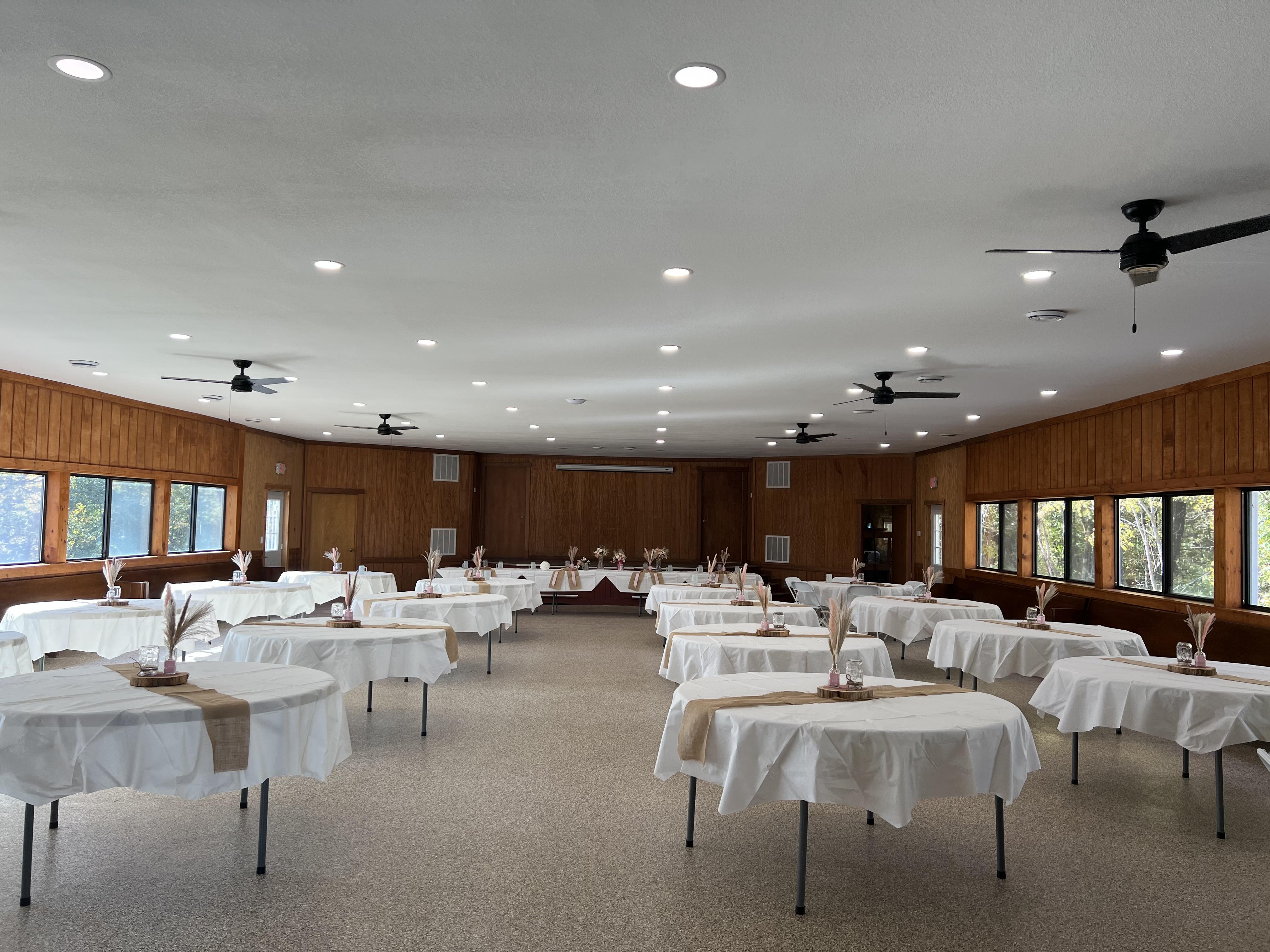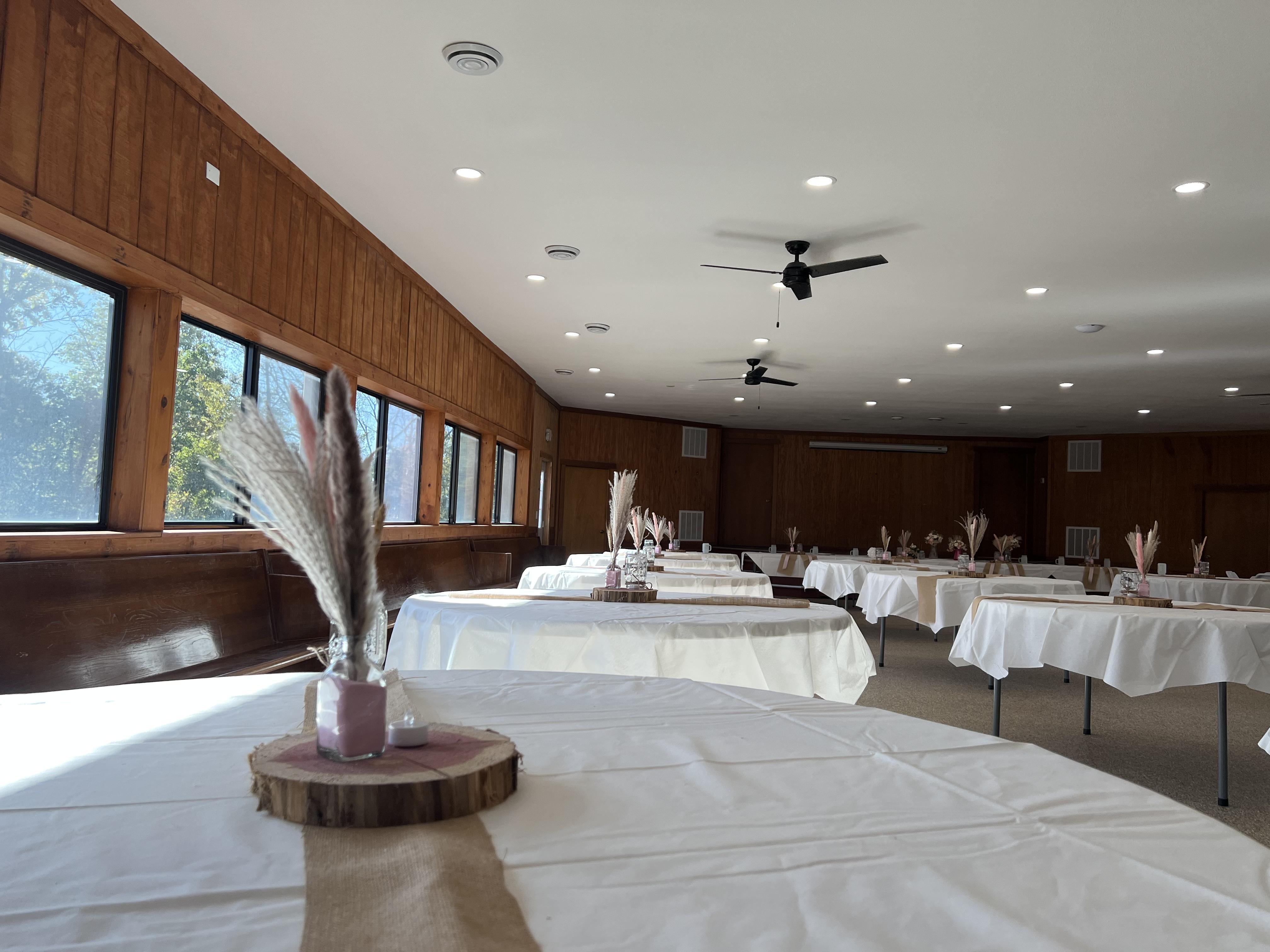 This space features a nearly 2500 square-foot indoor room. Has a buffet line convenient for feeding your guests. Also has a covered patio out the side door. We also have 16 cabins available to rent so all your guests can safely stay here.